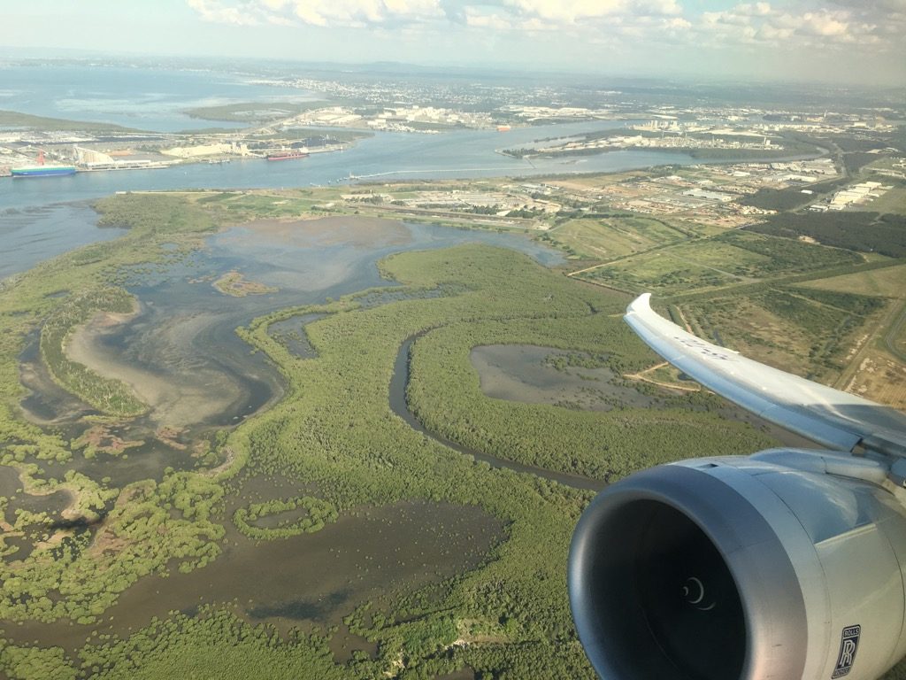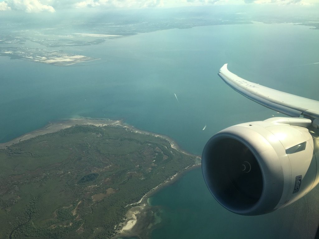 Gut gelaunt sind wir mit leichter Verspätung in Brisbane über die wunderschöne Gold Coast gestartet. Was mich beim Boeing 787 Dreamliner immer wieder beeindruckt ist der enorme „wing flex“ beim Start. Die Flügel und insbesondere die Flügelenden biegen sich beim Abheben sehr deutlich nach oben, was mich immer an Segelflugzeuge erinnert.