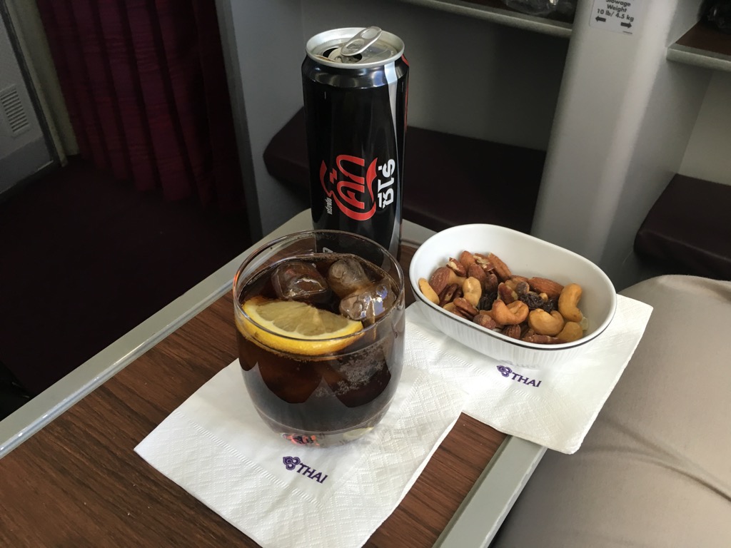 Thai bietet in der Business Class keine zweite Mahlzeit vor der Landung an, allerdings kann man sich den gesamten Flug über verschiedene kleinere Gerichte von einer „All- Day Dinning“ Karte bestellen. Direkt nachdem ich aufgewacht bin, wurde ich gefragt, ob ich noch etwas von diesem Menü essen möchte, allerdings hatte ich keinen Hunger, sodass ich nur noch etwas vor der Landung in Bangkok getrunken habe.