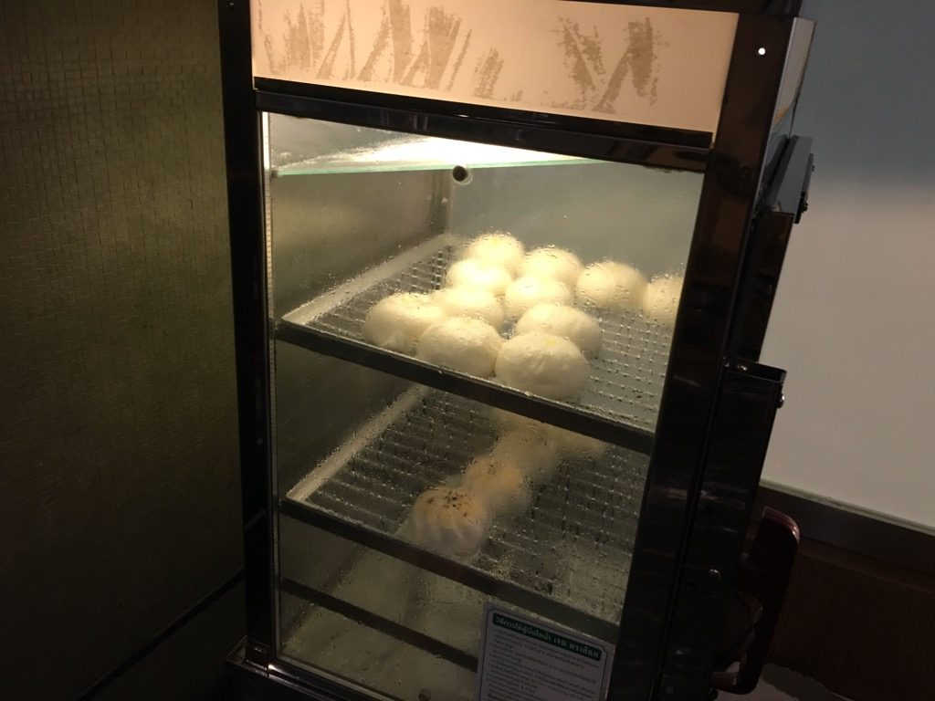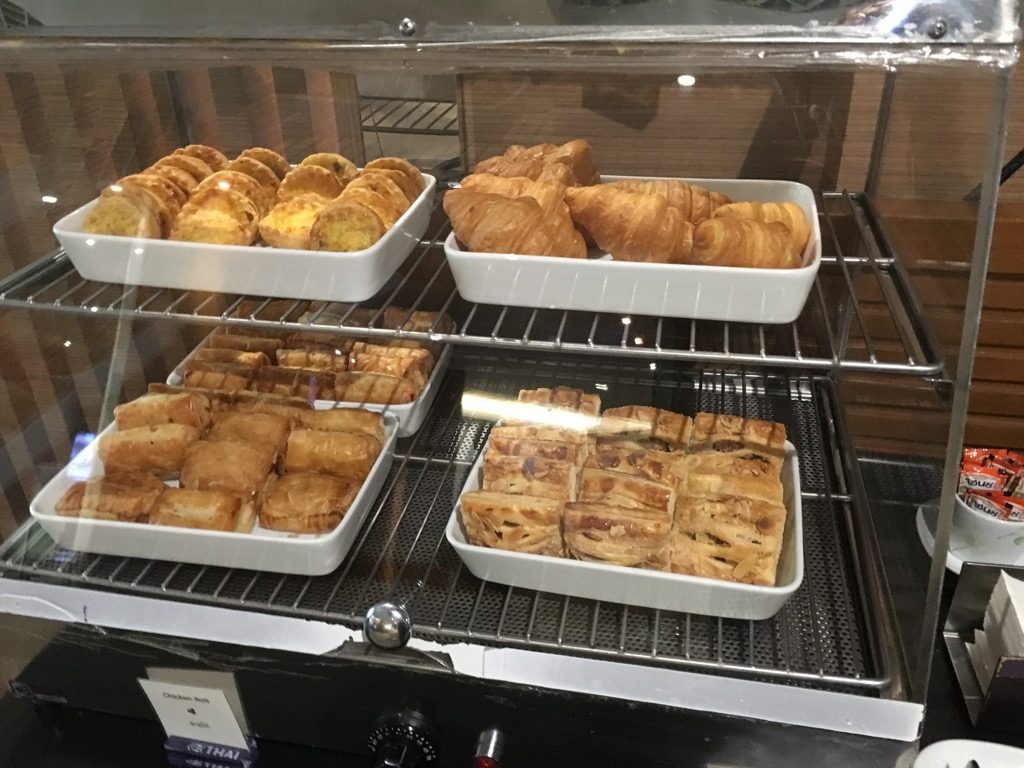 An einem Buffet in der Lounge wurde eine recht große Auswahl an Speisen angeboten. Neben Salaten, Sandwiches und Kuchen, gab es auch einige warme Speisen, wie Eier, Würstchen und Schinken, Quiche, Frühligsrollen und gefüllte asiatische Teigtaschen.