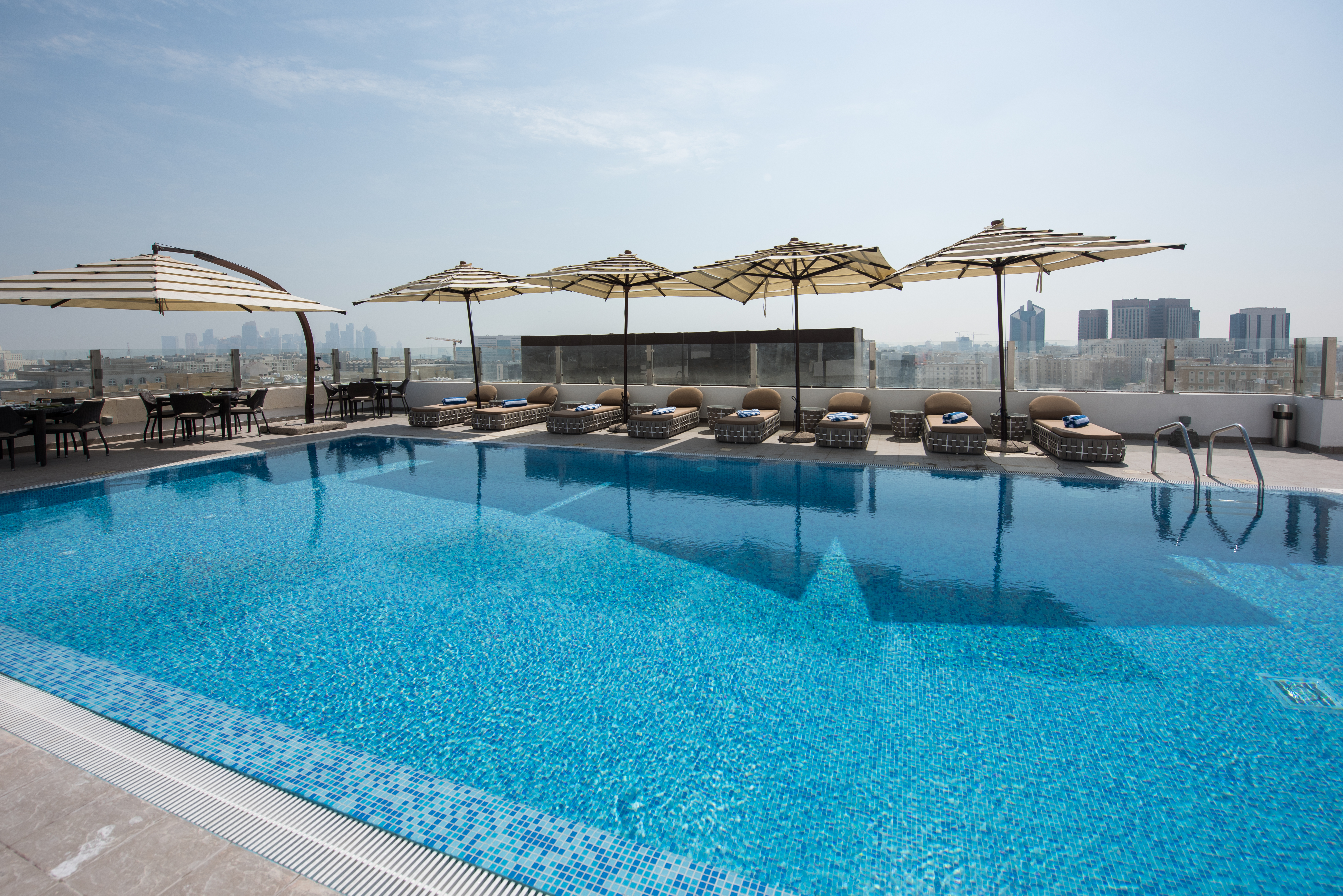 Das The Avenue A Murwab Hotel Doha verfügt über einen schönen Dachpool mit beeindruckender Aussicht über die Stadt. Da das Hotel nicht extrem groß ist, ist die Größe des Pools absolut ausreichend. Der Pool an sich ist gepflegt und sauber, ebenso wie die Liegen. Während den Pool Öffnungszeiten ist immer ein Life Guard anwesend, der sich auch um Handtücher und Sonnenschirme kümmert. Am Pool selbst befand sich noch eine Bar, welche während unserem Besuch geschlossen war. Man berichtete uns, dass hier bald regelmäßige Barbecues und eine Poolbewirtung stattfinden soll.