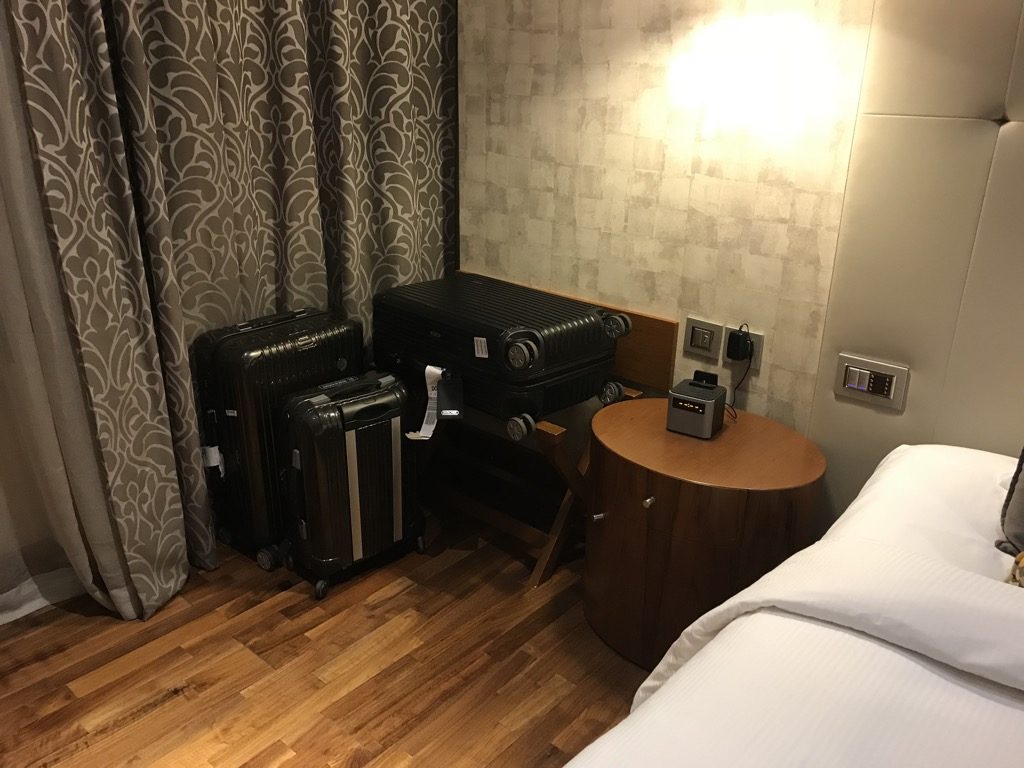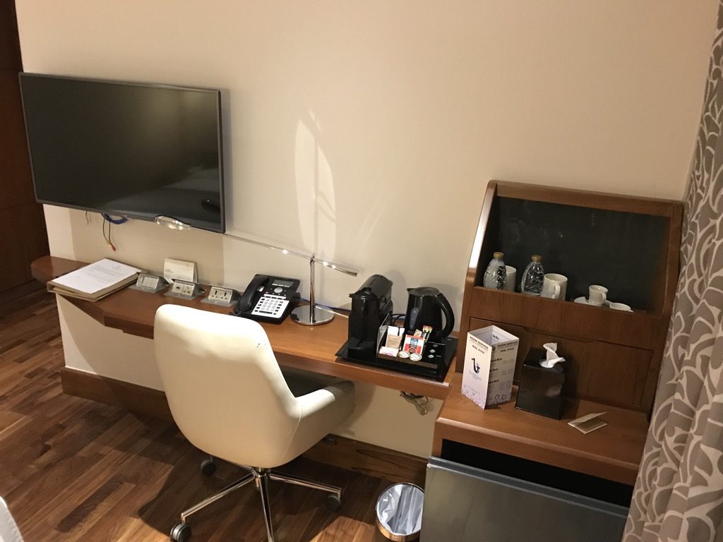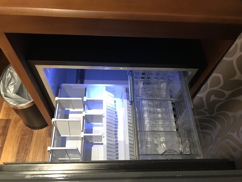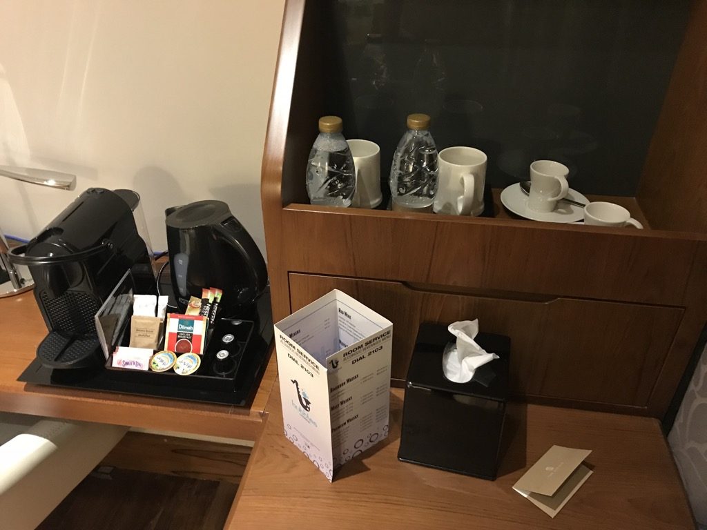 Neben dem Bett und direkt vor den Fenstern, befand sich eine Kofferablage, auf der schon mein Gepäck bereitstand. Gegenüber des Bettes befand sich ein großer Fernseher, ein kleiner Schreibtisch, mehrere Steckdosen und USB-Adaper und eine Kaffee- und Teestation. Unter der Kaffee- und Teestation befand sich ein Auszugkühlschrank, in dem man z.B. Getränke kühlen kann.