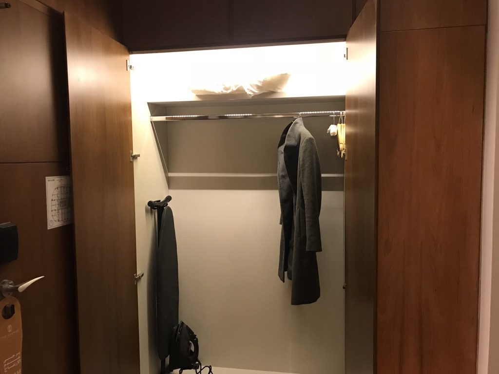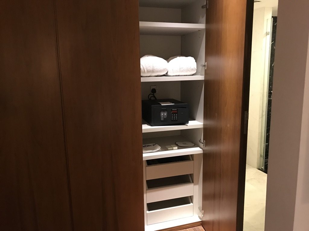 Unser Zimmer befand sich im zweiten Stockwerk, am Ende eines Flurs. Direkt nach dem Eintreten befand sich auf der linken Seite der große Schrank, in dem die üblichen Dinge wie Safe, Hausschuhe, Bademäntel und ein Bügeleisen untergebracht waren.