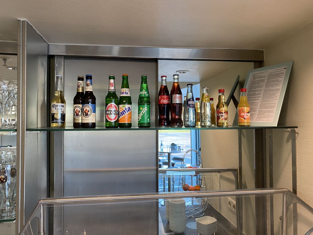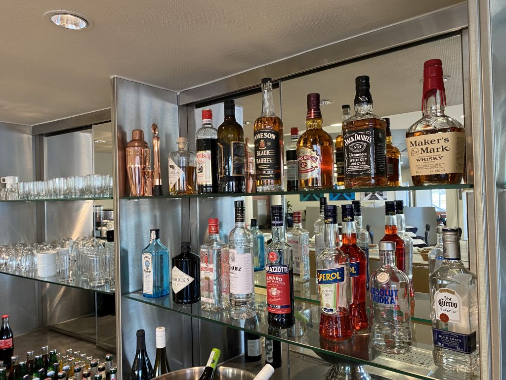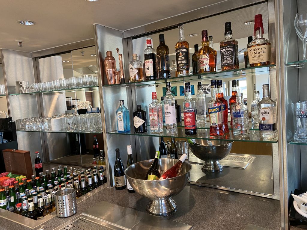 Die Auswahl an alkoholischen Getränken ist hochwertig. So gibt es zum Beispiel neben dem Standard Beefeater Gin, den man in anderen Lounges schon als bessere Variante anbietet, auch Bombay Sapphire und Hendricks. Als alten Düsseldorfer brachte mich der Killepitsch zu nostalgischen Erinnerungen. Meine russische Seele wurde durch den Absolut Vodka befriedigt und auch der Whiskey Liebhaber wird mit Marker’s Mark und Chivas Regal (neben Jack Daniels und Jameson) nicht enttäuscht. Für den Notfall stand auch ein Cocktail-Shaker im Regal. Ob begleitend zum Aperol auch ein Sparkling Wine vorhanden war, ist mir leider entgangen. 🙂