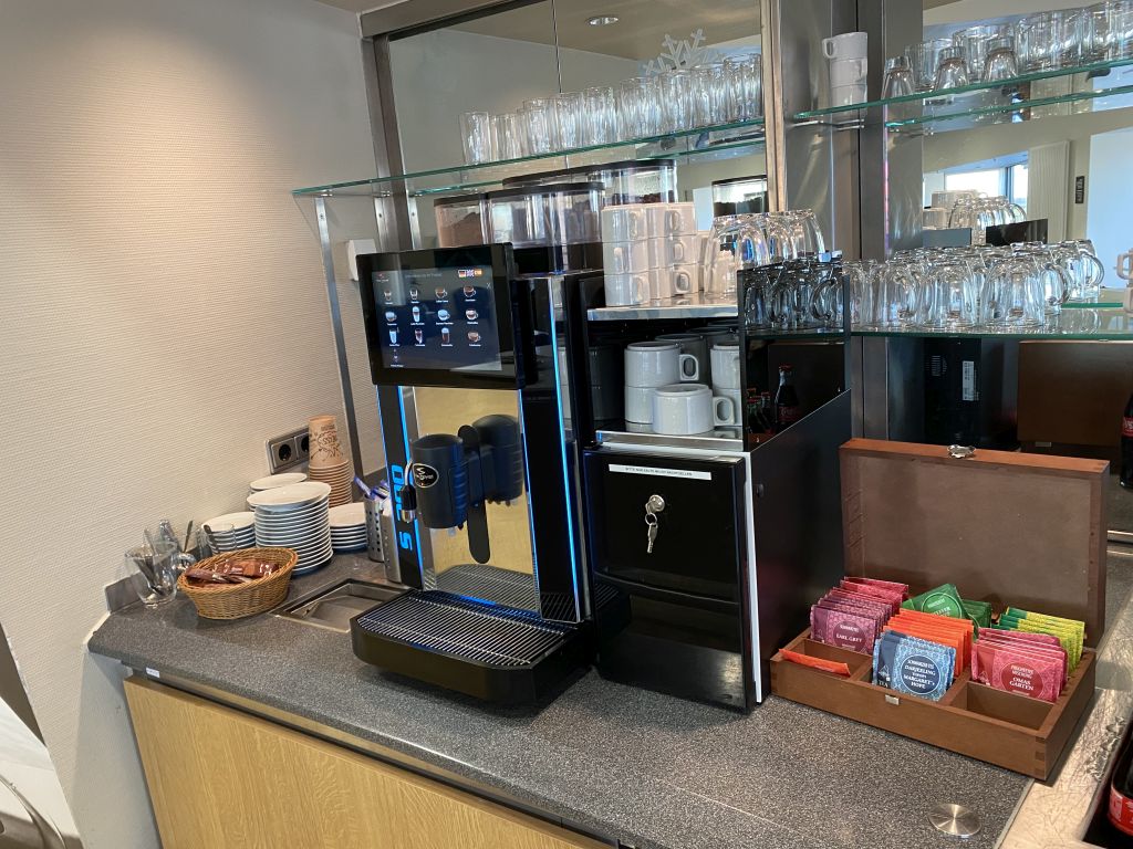 Neben Softdrinks wie Fanta, Cola und Wasser, gibt es auch einen Kaffeevollautomaten und Tee.