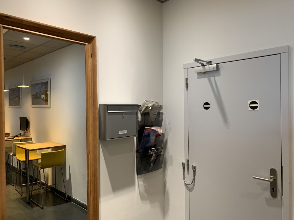An einer Wand stehen drei Hochtische mit Barhockern und einem Bildschirmarbeitsplatz. Und an der Wand direkt gegenüber stehen noch mal drei Lounge-Sessel mit Bistro-Tischen.