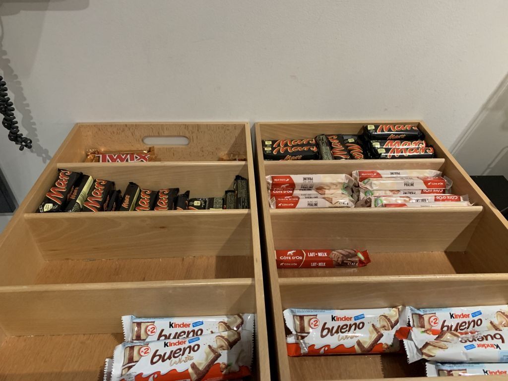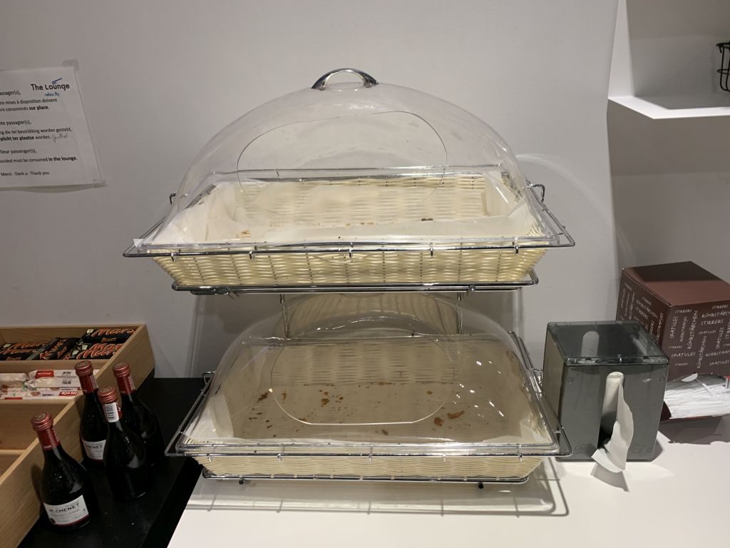 Es gibt super Schokoriegel, wie Kinder Bueno, Twix und auch belgische Schokolade. Das war es bei unserem Besuch aber dann auch schon. Zwar standen in der Lounge noch zwei Körbe, in denen normalerweise kleine Croissants bereit liegen, aber die waren diesmal leer.