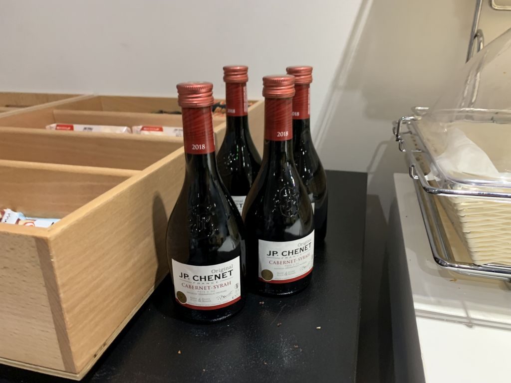 In einem Kühlschrank befanden sich außerdem Cola, Sprite und Wasser. An alkoholischen Getränken steht lediglich Wein in kleinen Flaschen zur Verfügung. Der JP Chenet ist allerdings als Weißwein so ungenießbar, dass wir zum Rose griffen. Zumindest so lang bis die drei Flaschen leer waren. Auch den Wein tranken wir mangels Alternative aus Pappbechern. Wobei meine bessere Hälfte klüger war, denn sie entdeckte die normalen Pappbecher für Kaffee, während ich meinen Wein aus der Espresso-Größe schlürfte.