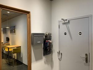 Ein kleines Zeitschriften-Regel ist noch neben einem Briefkasten an der Wand montiert. Weitere Zeitschriften sind über den Tisch gegenüber dem Buffet verteilt.
