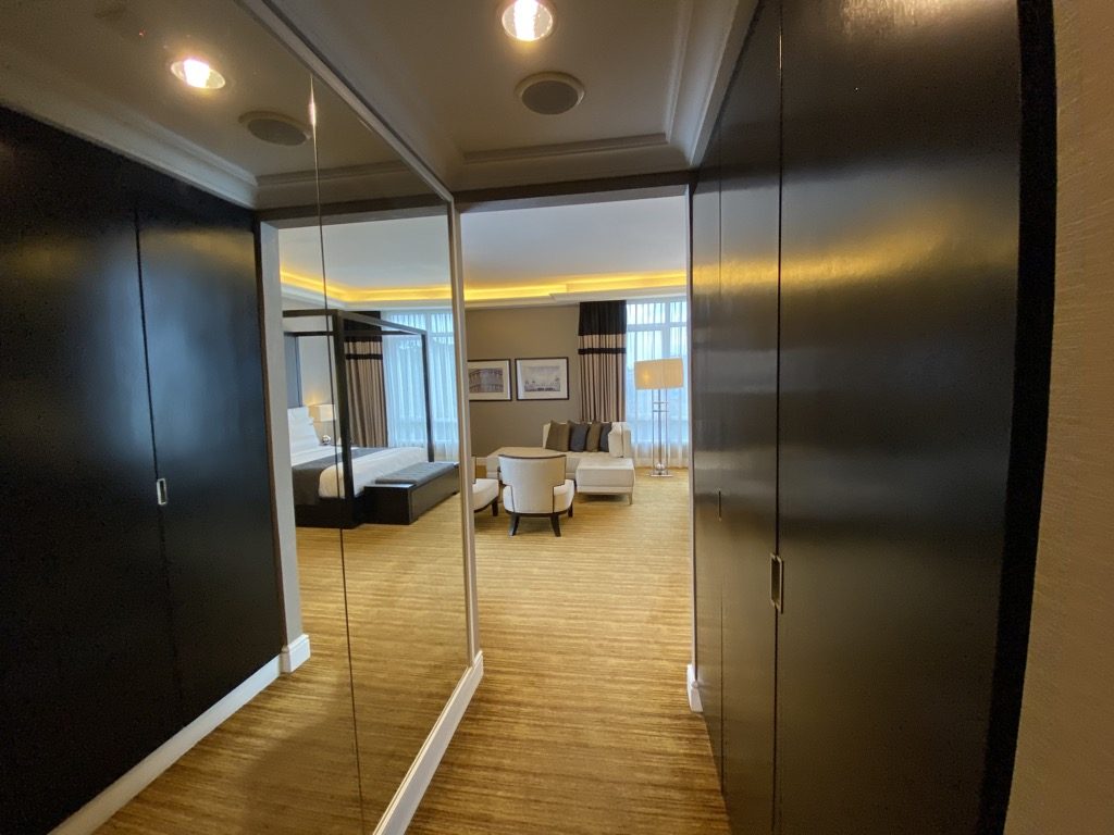 Unsere Junior Suite befand sich auf der neunten Etage ganz hinten – also ein Ecksuite. Direkt nach dem Betreten war auf der rechten Seite ein Einbauschrank verbaut, in dem auch der Safe, Bademäntel, Hausschuhe und ein Bügeleisen untergebracht waren, verbaut.