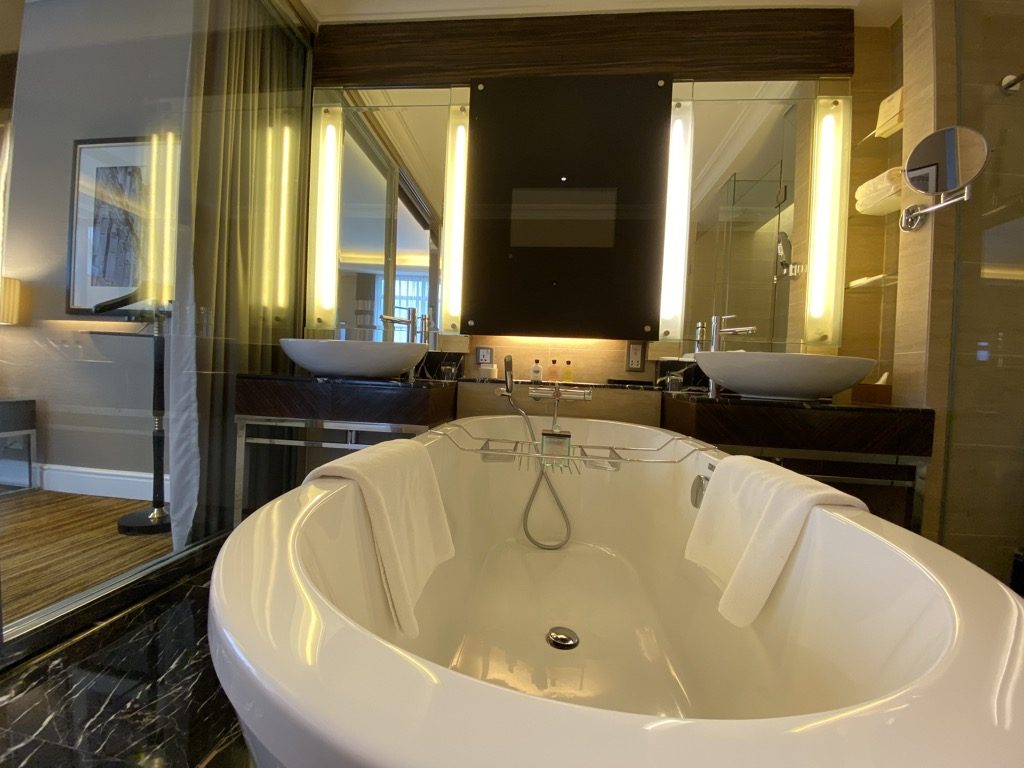 Ein wirkliches Highlight der Suite war definitiv das Badezimmer mit Doppelwaschbecken, freistehender Badewanne und Dusche mit Regenduschkopf. Positiv zu erwähnen ist, dass die Toilette mit einer Tür verschlossen werden konnte. Auch das gesamte Bad konnte mit einer Schiebetür und einem Vorhang vom restlichen Zimmer abgeschirmt werden. Hier begrüßte uns natürlich eine vollständige Auswahl Amenities.