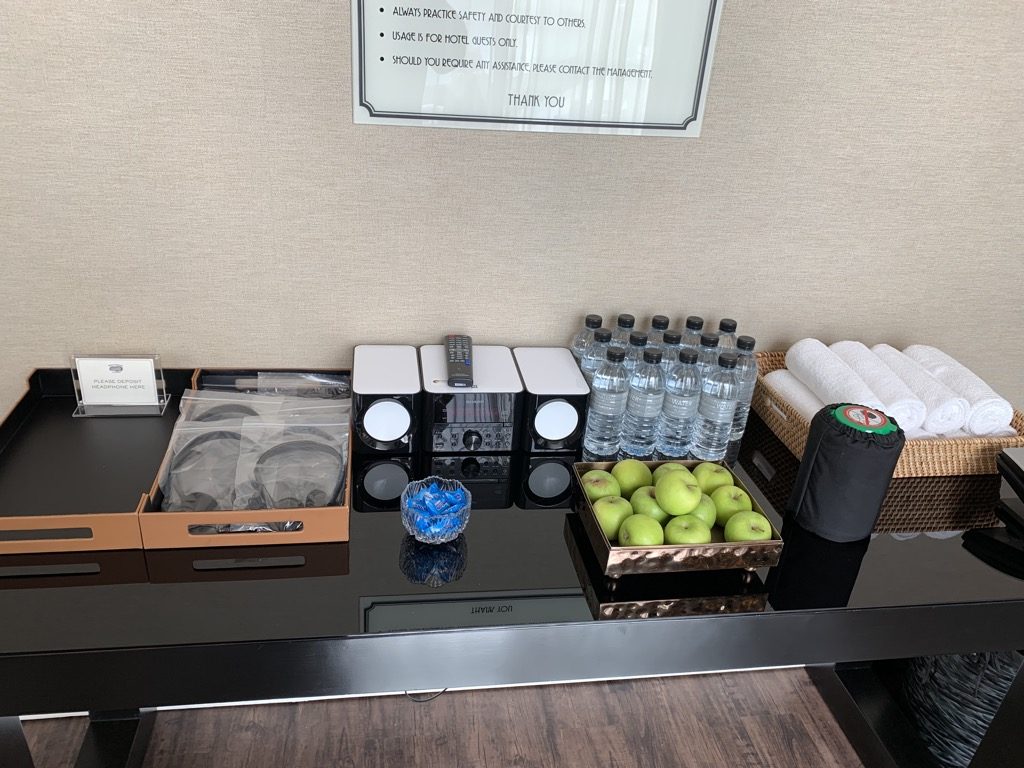 Das Gym war für die Größe des Hotels angemessen, aber insgesamt nicht besonders groß. Dennoch fand man alles, was man für ein Training benötigte. Toll war, dass ausreichend Wasser bereit stand. Auch für den kleinen Hunger waren Äpfel vor Ort.