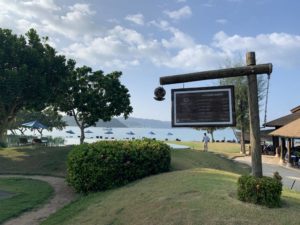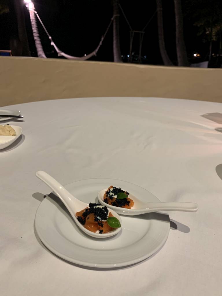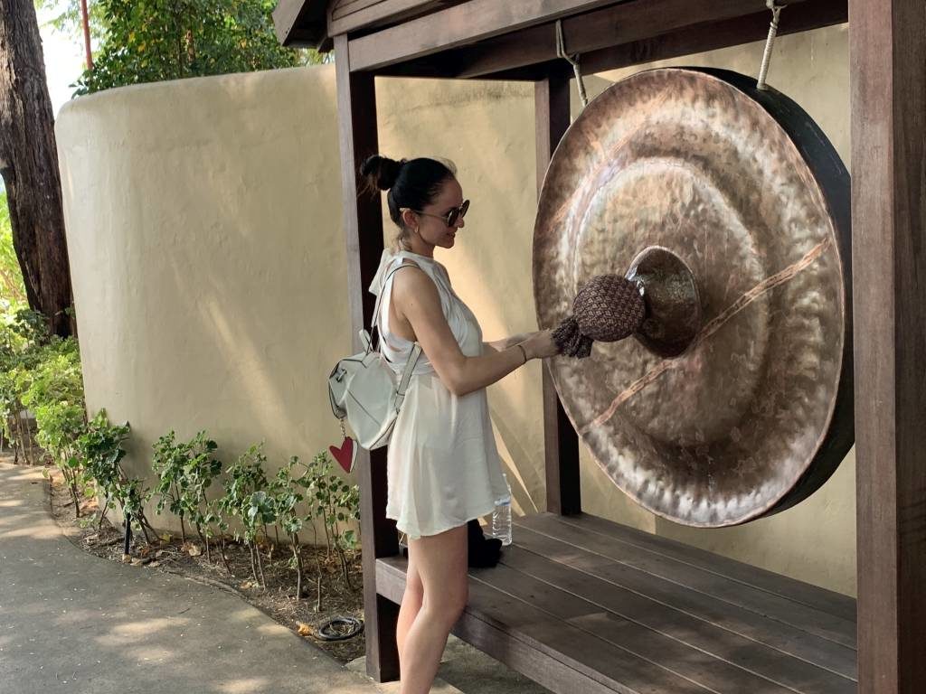 Nach der kurzen etwa fünfminütigen Bootsüberfahrt wurden wir zunächst mit einem weiteren Golfbuggy zu einem „Gong“ gefahren. Dort steht die Willkommenszeremonie an, bei der jeder Gast zwei Mal gegen einen Gong schlägt. Danach gibt es ein kleines alkoholfreies Begrüßungsgetränk in einem Shot-Glas.