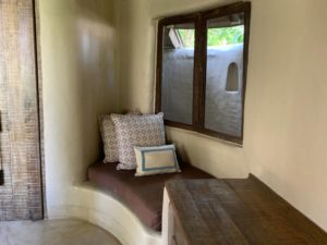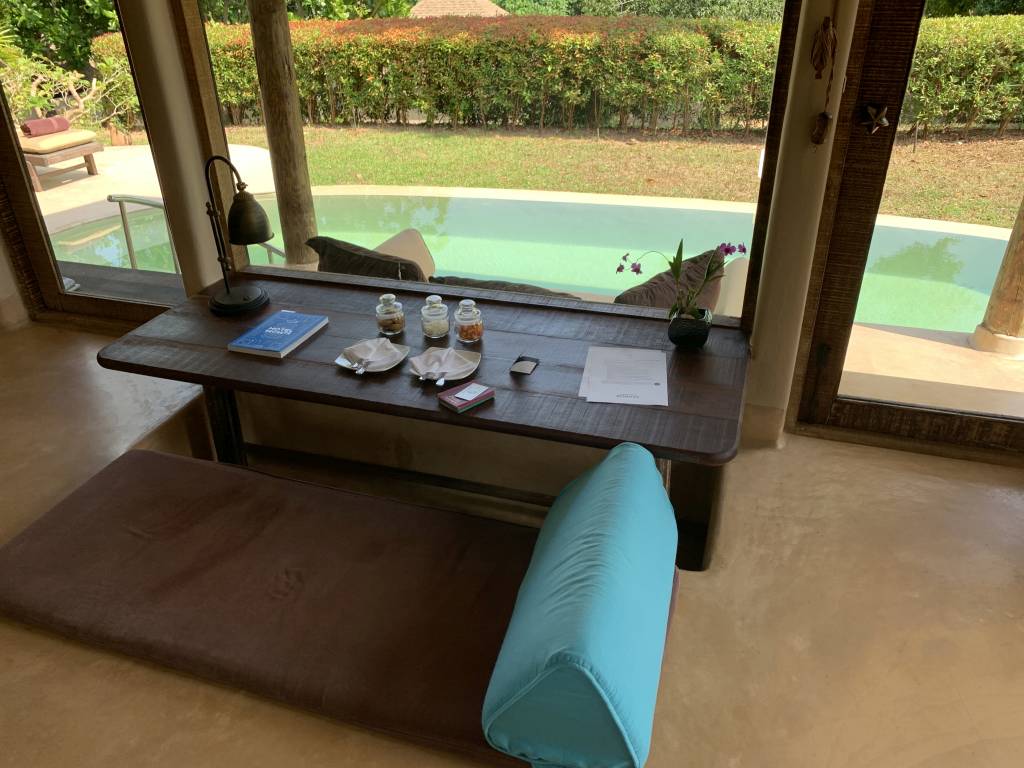 Um den Pool herum gibt es zwei Liegen, eine überdachte Couch und einen Pavillon mit Matratzen auf dem Boden. Während wir auf den Liegen zumindest gelegentlich etwas Sonne einfangen konnten, eignete sich der riesige Pavillon gut, um abends noch gemütlich etwas Zeit im freien zu verbringen. Der kleine Beistelltisch diente gleichzeitig auch als Schachbrett, für das die Figuren im inneren der Villa lagen.