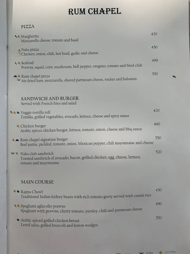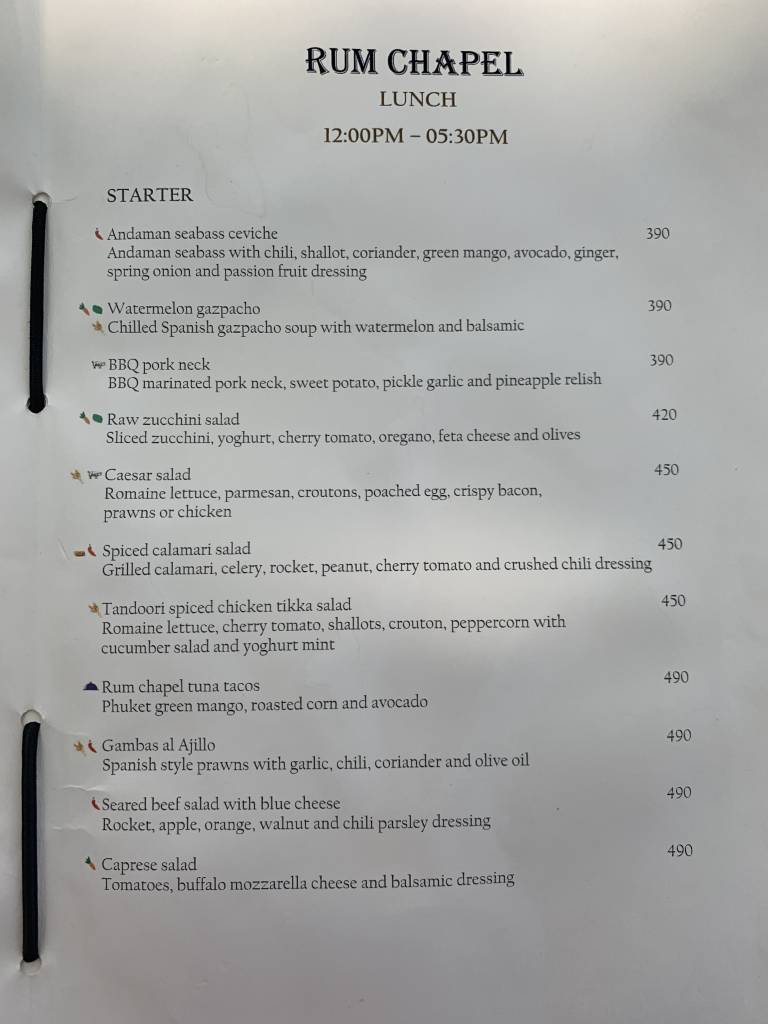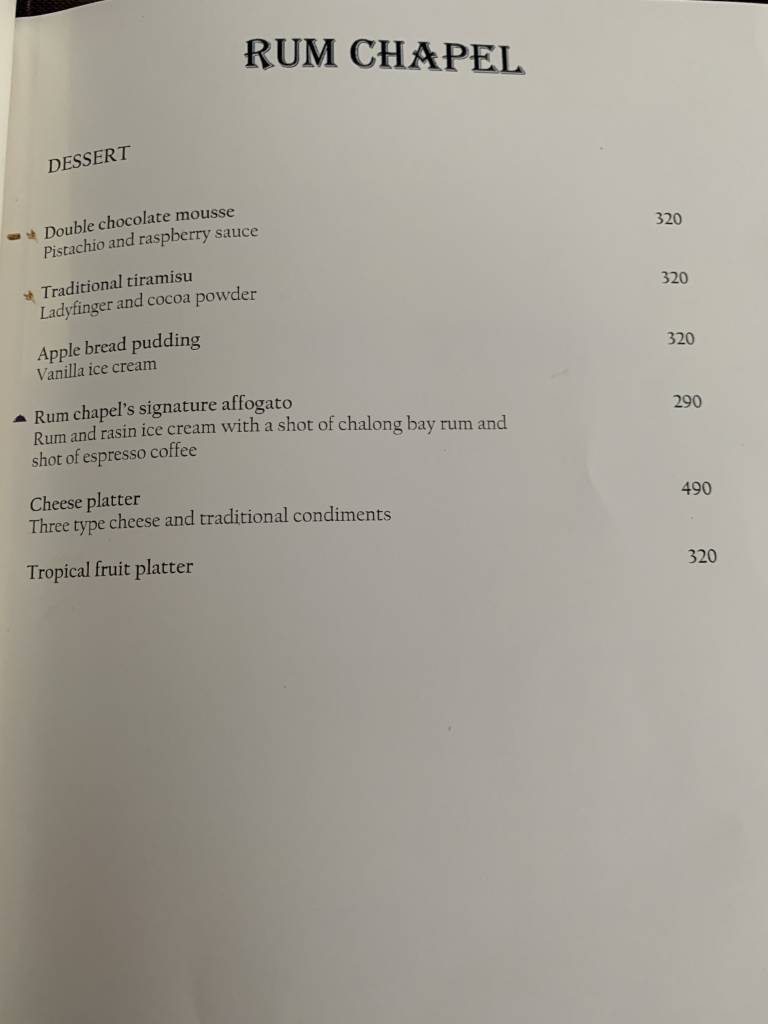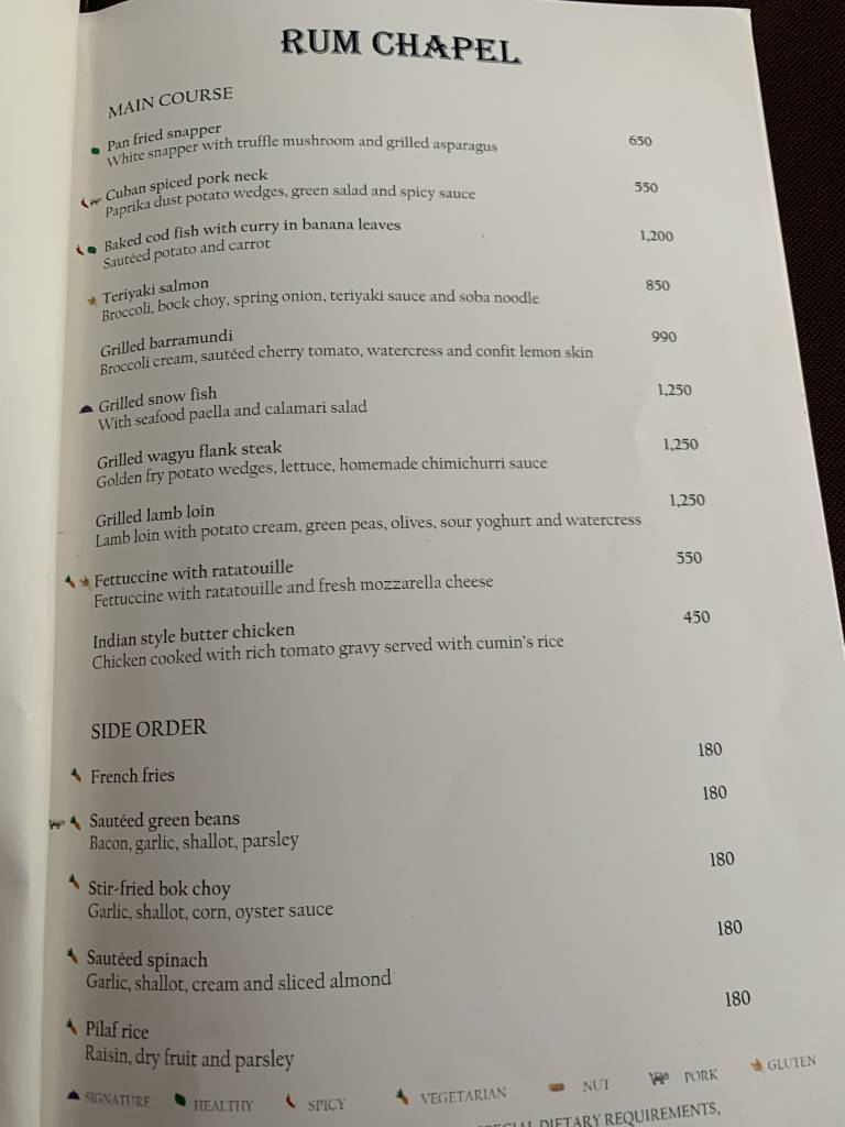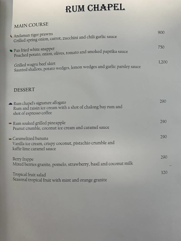 Das neuste Restaurant ist die „Rum Chapel“, welche tagsüber auch das Essen am Pool und am Strand serviert. Abends stehen westliche Speisen mit lokalem Einschlag auf der Speisekarte.
