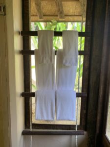 Auch der Turn-Down-Service hat diesbezüglich gut geklappt. Und hier war der Turn-Down-Service auch wirklich sinnvoll. Es wurde nicht nur das Bett aufbereitet, sondern auch das Moskito-Netz um das Bett gehängt und einige Teelichter aufgestellt. Direkt nach der ersten Nacht hat das House-Keeping erkannt, dass wir abends gerne noch etwas unter dem Pavillon liegen und ihn daher täglich mit neuen Handtüchern ausgestattet. Nur eines der vielen kleinen Details.
