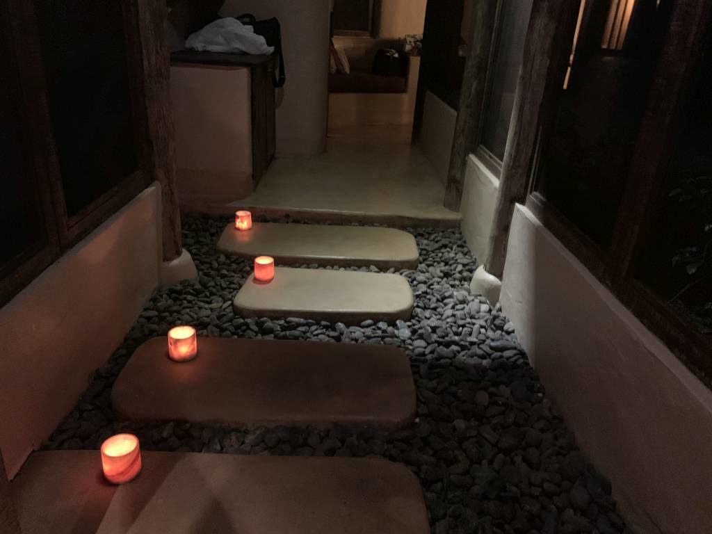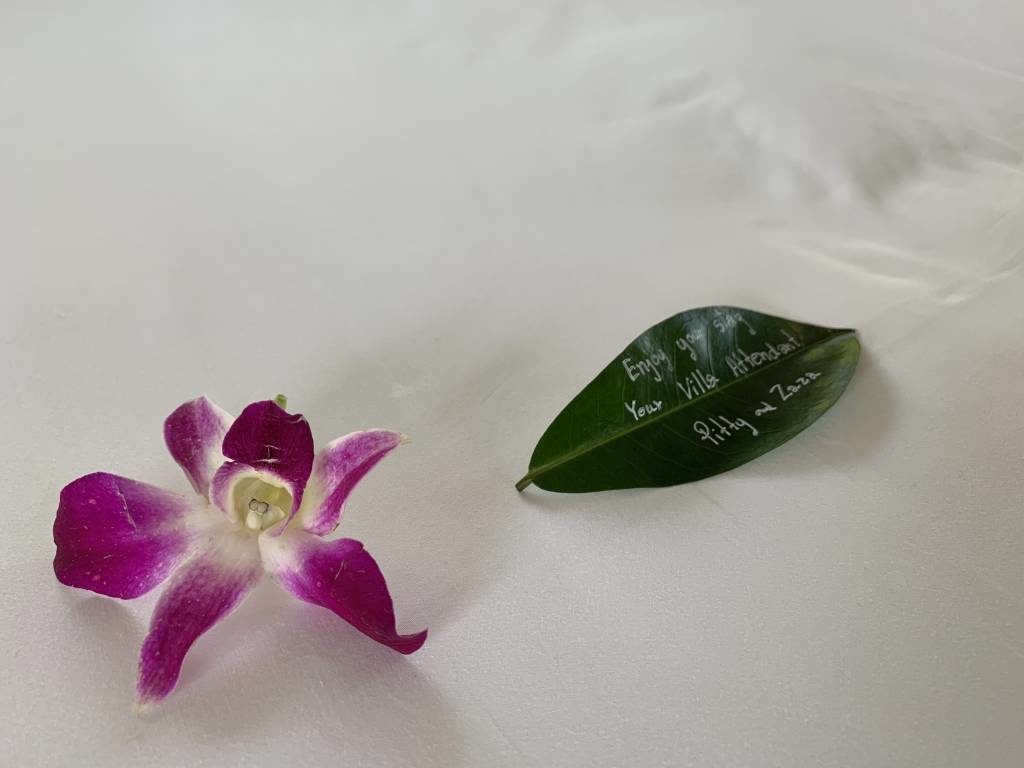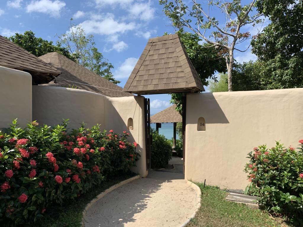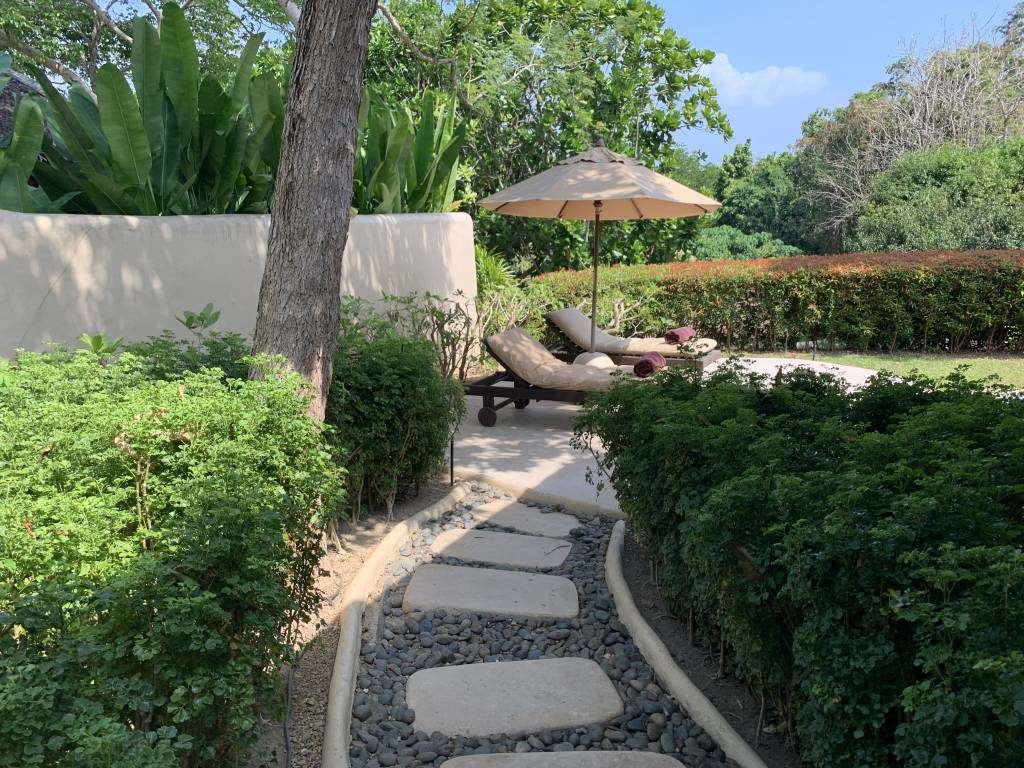 Unsere Tropical Pool Villa war komplett durch Wände oder Hecken umzäunt, so dass wir hier ein hohes Maß an Privatsphäre hatten. An der Eingangstür zur privaten Anlage befand sich eine Tür-Klingel und ein „Do not disturb“-Stein (ja „Stein“, nicht „sign“). Ein kleiner sandiger Fußweg führt dann sowohl zur Villa als auch zum eigenen Garten.