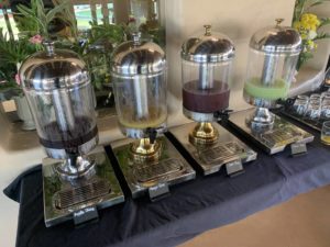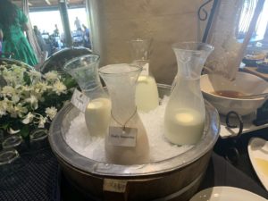 Kaffee-Spezialitäten werden auf Wunsch am Tisch serviert, während eine umfangreiche Auswahl an Säften zur Selbstbedienung angeboten wird. Zum Aufpreis von 120 Baht serviert man auch ein Glas Prosecco. Mit entsprechendem Marriott Bonvoy Status ist dieser Service kostenlos. Für alle Gäste ist hingegen Bloody Mary zum Frühstück kostenlos.