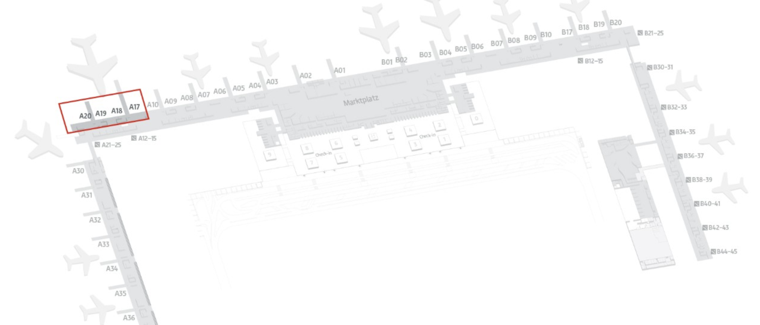 Die THF Lounge befindet sich im Bereich des Gates A20. Zirka fünf Minuten nach der Sicherheitskontrolle ist diese zu erreichen. Wie bei der Lufthansa Lounge gelangt man über eine Treppe oder Lift in das obere Stockwerk.
