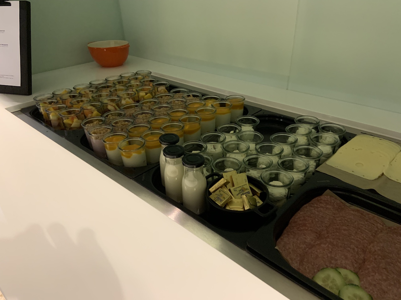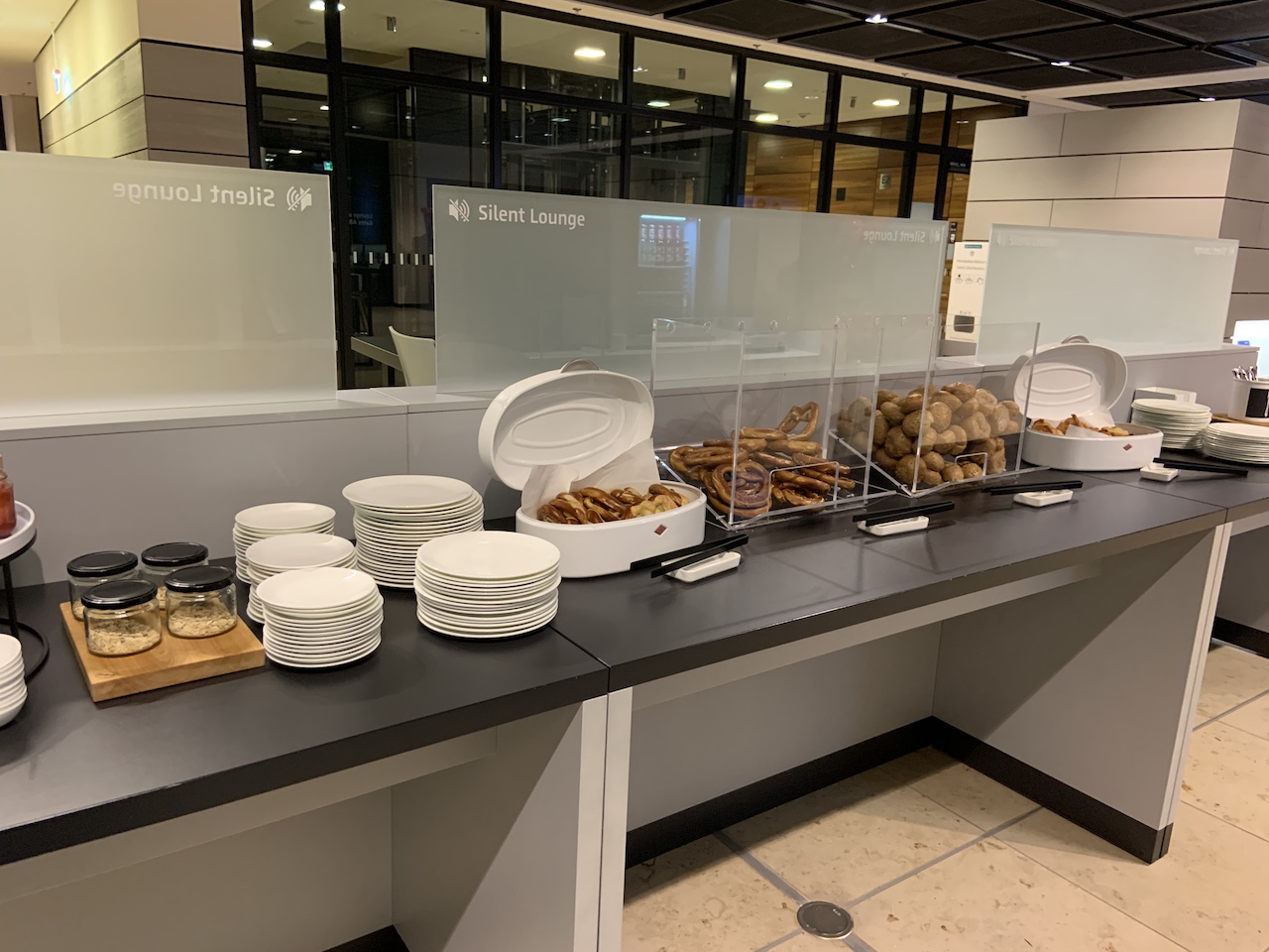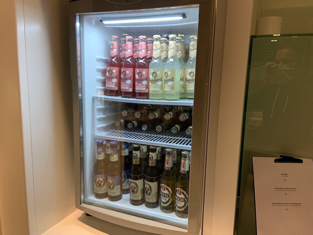 Da ich die Lounge zu sehr früher Stunde besuchte wurde Frühstück serviert. Die Auswahl empfand ich als durchaus üppig. Neben Brötchen und Brezeln wurde auch Obst, Aufschnitt, Käse, Joghurt und sogar Kuchen angeboten.