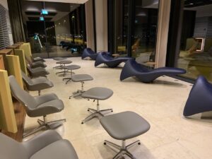 Hier befindet sich auch eine Anzeigetafel mit den Abflügen – Ansagen werden nicht gemacht. Sehr auffällig und positiv zu erwähnen sind die vielen verschiedenen Sitzmöglichkeiten. Barhocker nebst Hochtischen, Loungesessel, Relaxliegen und auch normale Tische und Stühle lassen für jeden den geeigneten Platz finden.