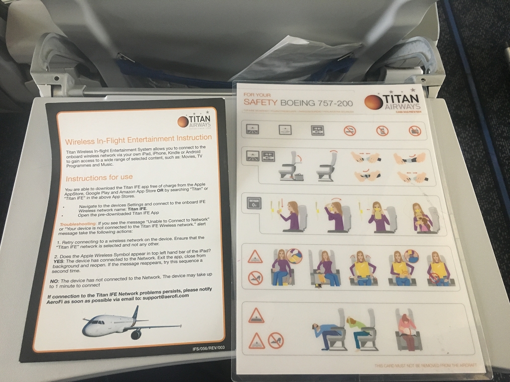 Die 757-200 der Titan Airways hat eine Ecnonomy-only Konfiguration mit den bekannten sechs Sitzplätzen je Reihe. Da die Verteilung der Sitzplätze zwischen den beiden Airlines und Mustern annähernd gleich ist und der Flug nicht ausgebucht war, konnte zunächst jeder seinen Sitzplatz behalten und dann nach freigebliebenen Reihen suchen.