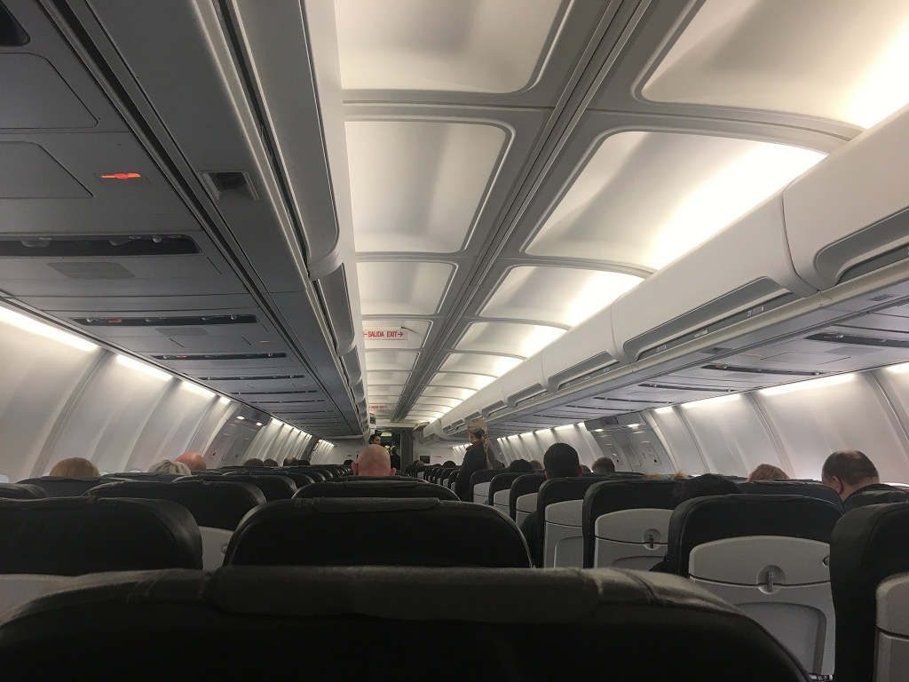 Daher spurtete ich zum Gate – das Boarding war schon fast abgeschlossen – und stand dann in der Einstiegsbrücke im Stau. Also guckte ich nach vorne und sah die Einstiegstür, die irgendwie nicht wie die eines von einer irischen Fluglinie betriebenen A321 aussah. Spätestens beim Einstieg wurde mir klar, dass es sich hier um ein anderes Muster handelte. Die Crew war anders gekleidet und die Kabine in Grautönen gehalten.