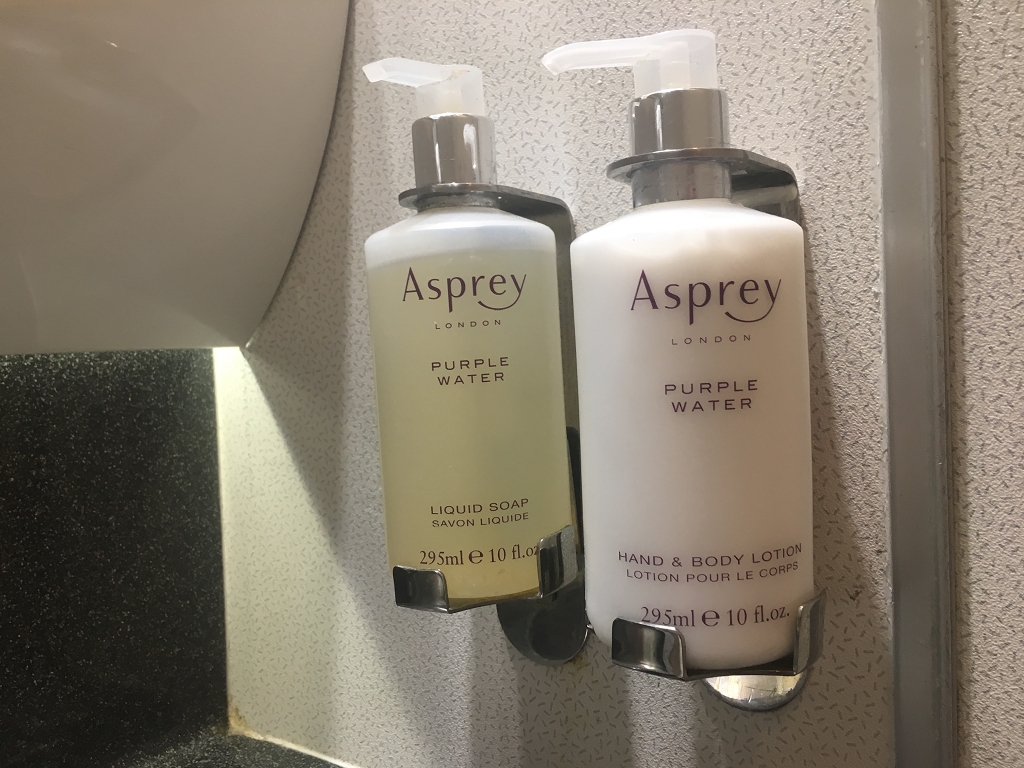 Die Amenities in der Bordtoilette waren überraschend – es gab Seife und Handcreme von Asprey (Purple Water). Für jemanden, der gerne in Hotels von Marriott übernachtet ist das natürlich ein Highlight, denn Purple Water ist aktuell fester Bestandteil der Badausstattung in Ritz-Carlton Hotels.