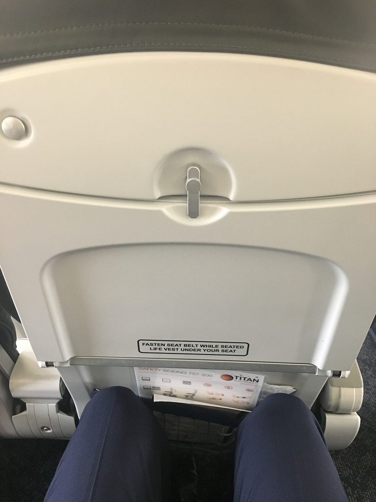 Die 757-200 der Titan Airways hat eine Ecnonomy-only Konfiguration mit den bekannten sechs Sitzplätzen je Reihe. Da die Verteilung der Sitzplätze zwischen den beiden Airlines und Mustern annähernd gleich ist und der Flug nicht ausgebucht war, konnte zunächst jeder seinen Sitzplatz behalten und dann nach freigebliebenen Reihen suchen.