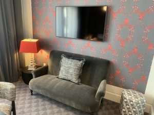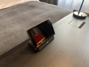 Neben dem Einbauschrank stand eine gemütliche Couch, darüber hing der großzügige Fernseher. Mittig im Zimmer, vor dem Fußende des Bettes, konnte man an einem Schreibtisch arbeiten. Auf dem Schreibtisch stand ein Tablet, in dem man allerlei Informationen über das Hotel und Hamburg finden konnte. In der Tischplatte waren USB-Anschlüsse und eine Steckdose verbaut, um seine elektronischen Geräte zu laden.
