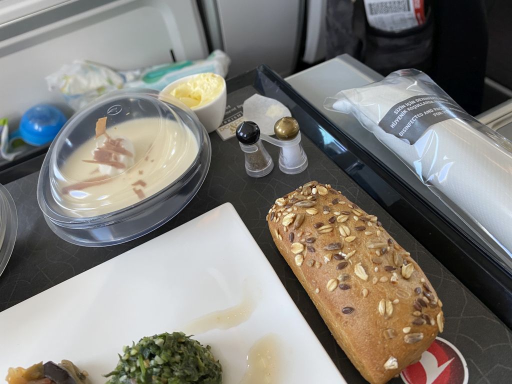 Bereits nach kurzer Flugzeit wurde auch ein Tablett mit Vorspeisen und Nachtisch serviert. Neben türkischen Meze gab es auch einen Joghurt mit Gurken (als Banause würde ich es türkisches Tsatsiki nennen) zum Start. Dazu wurden ofenfrische Brötchen gereicht.