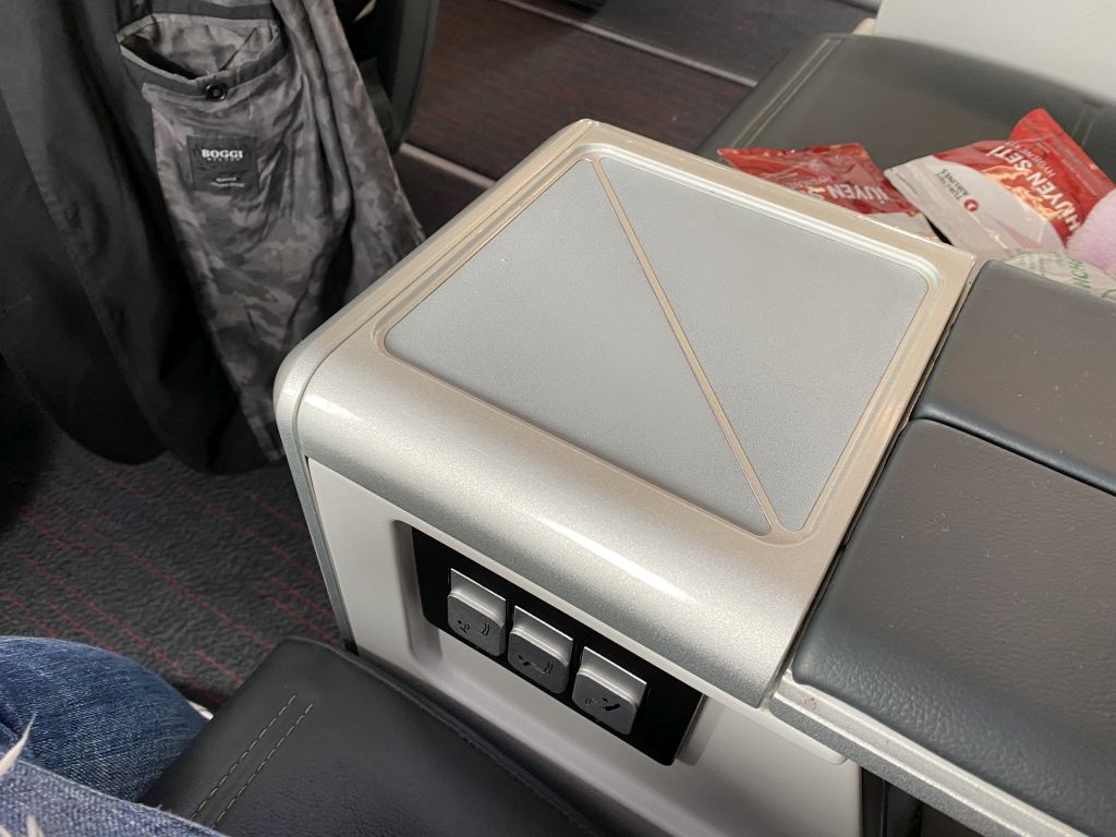 Der große Klapptisch lässt sich per Knopfdruck aus der Armlehne herausfahren. Für ein Getränk ist aber auch auf der Mittelkonsole ausreichend Platz. Ausreichend Platz befindet sich auch im Ablagefach unter der Mittelkonsole.
