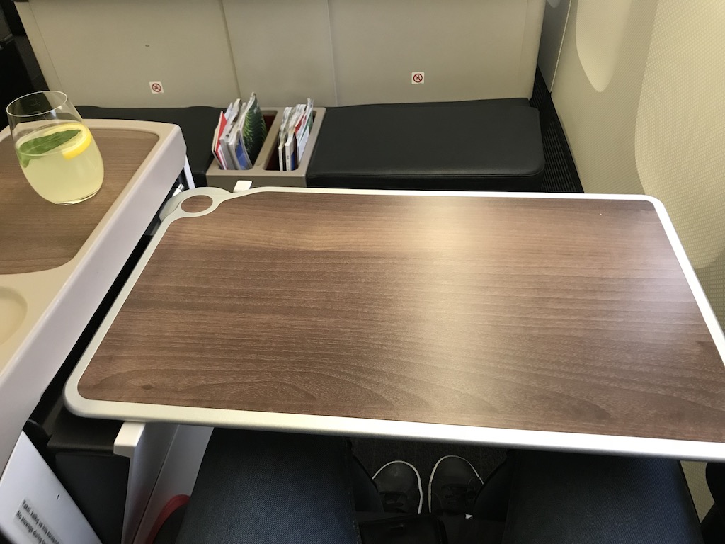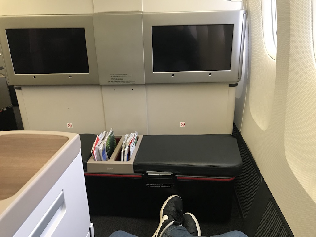 Direkt unter dem Bildschirm für das Inflight-Entertainment-System findet sich der großräumige Fußbereich, in dem sich auch ein großes Ablagefach befindet. Meine Weekendertasche konnte ich hier wunderbar verstauen.