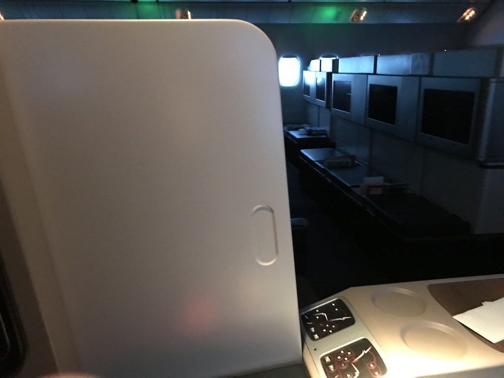 Weiterhin gibt es die Möglichkeit, händisch eine Trennwand zwischen den Sitzen auszufahren, die die Privatsphäre doch etwas erhöht, was gerade bei fremden Sitznachbarn von einigen Leuten gewünscht ist. Leicht versteckt gibt es auch die Kopfhöreranschlüsse und eine USB-Steckdose.