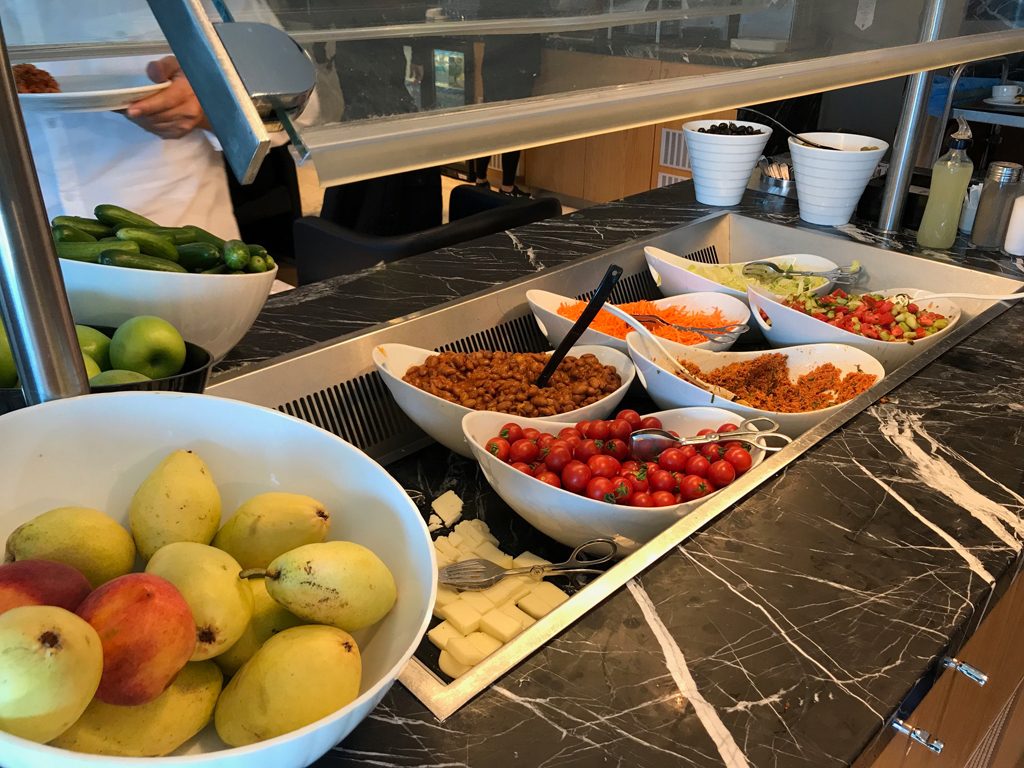 Turkish Airlines bietet an mehreren Stationen Salatvariationen, eine Suppe, etwas Obst sowie verschiedene kleine Desserts an.