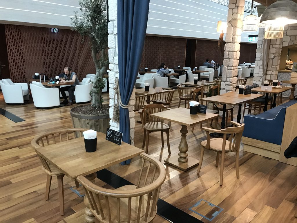 Insgesamt wirkt das Angebot an Sitzmöglichkeiten in der neuen Lounge deutlich größer als in der nun geschlossenen Vorgängerlounge. Die Esstische-/stühle in neuem und rusikal-modernen Design wurden hier eingebunden.