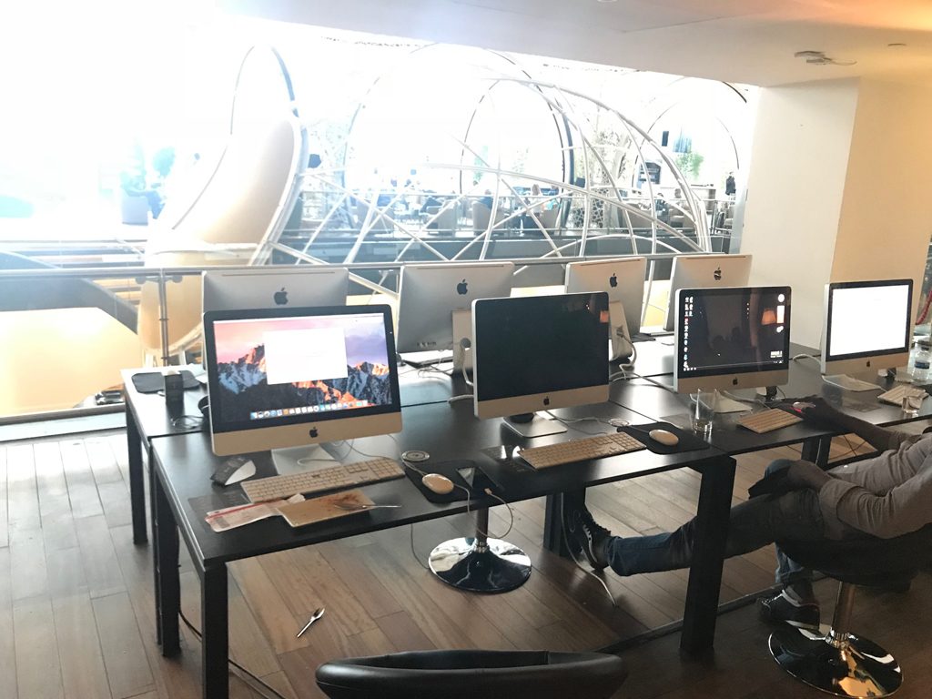 Ferner steht auf jeder Etage ein großer Computerarbeitsplatz zu Verfügung, an dem mit dem eigenen Laptop bzw. einem modernen iMac gearbeitet werden kann. Selbstverständlich können auch Dokumente ausgedruckt und/oder kopiert werden.