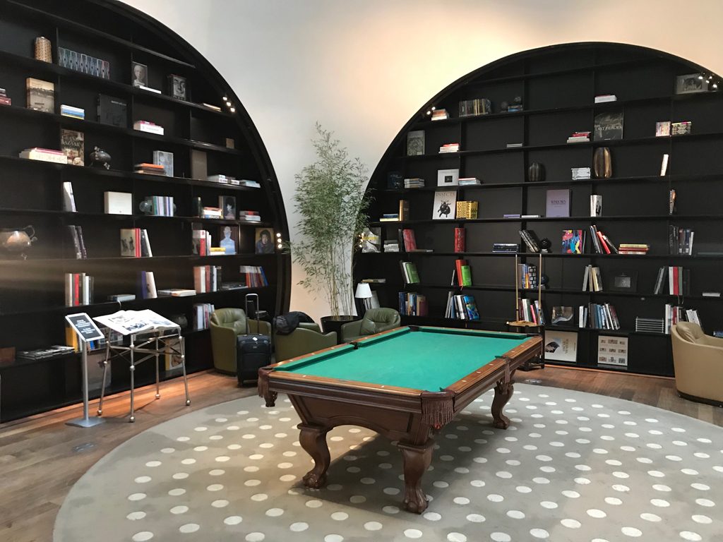 Am Eingang der Lounge befindet sich zunächst eine große Schließfachanlage, in der sperriges bzw. nicht benötigtes Handgepäck während des Aufenthaltes verstaut werden kann. Auch kann man nach dem Betreten gleich eine Runde am Billardtisch spielen bzw. ein Buch ausleihen.