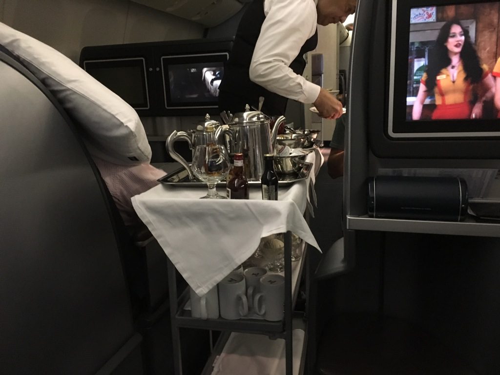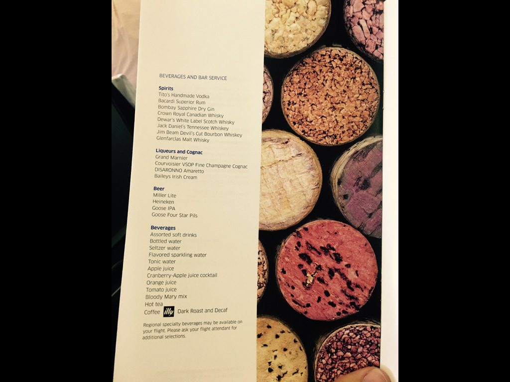 Der Purser fragte kurze Zeit später die Hauptgänge ab, bevor sehr zügig mit dem Service begonnen wurde. Von einem Wagen herrunter wurde der erste Getränkeservice durchgeführt. Grundsätzlich bekommt man bei United Airlines immer ungefragt stilles Wasser und warme Nüsse serviert und kann sich den Aperitif seiner Wahl bestellen.