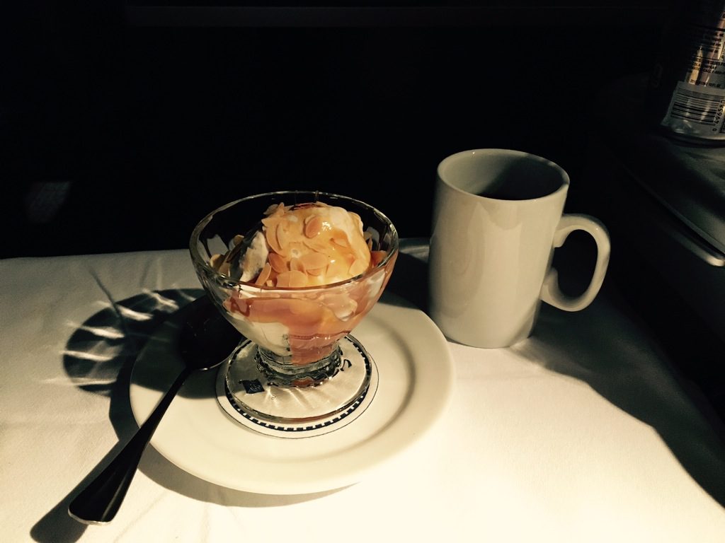 Nach dem Käse folgte der Dessert, beziehungsweise Eiscremewagen. Seinen Eisbecher kann man sich selbst mit verschiedenen Soßen, Nüssen und Streuseln, sowie Sahne zusammenstellen. Hierzu gibt es Kaffee, Tee sowie ein Digestif.