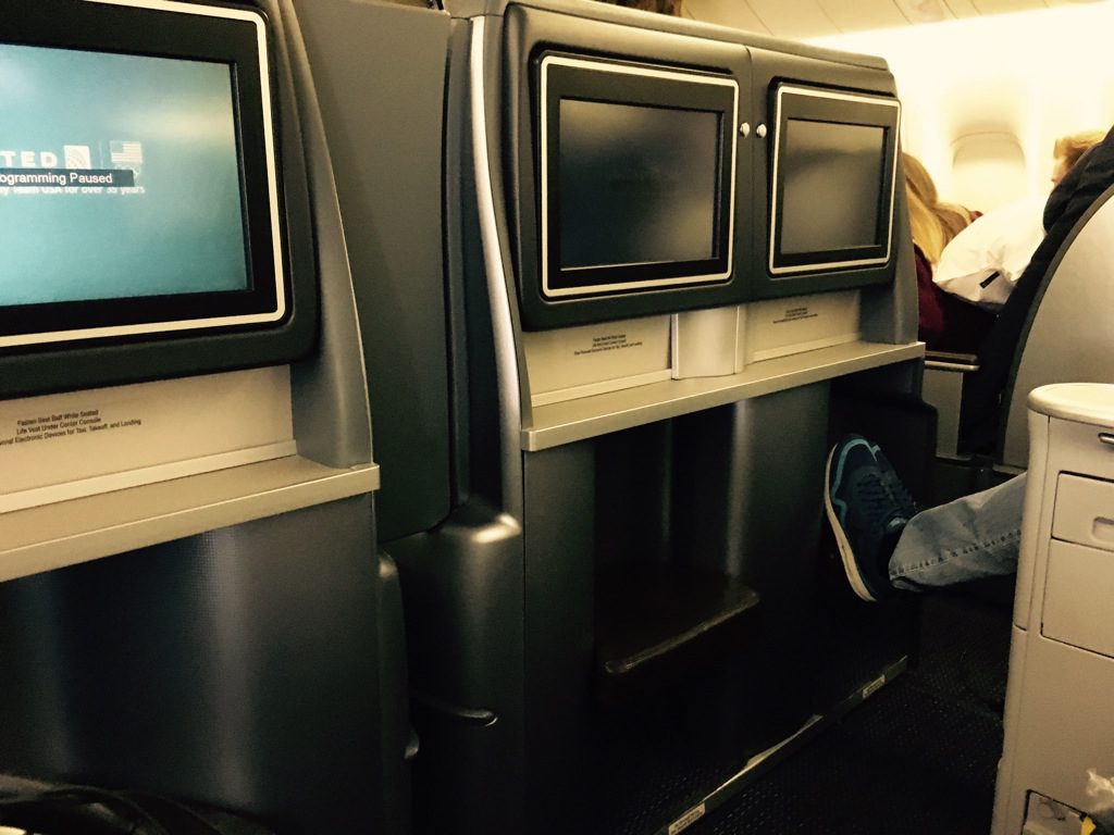 Der United Busines Class Sitz lässt sich 180° flach stellen. Dabei befindet sich ein angenehm großes Fußfach unter den Bildschirmen. Zwar hat man unter der Fußablage grundsätzlich einiges an Stauraum, allerdings legt United Airlines sehr großen wert darauf, dass in der Business und First Class alle Gepäckstücke in den Overhead Bins verstaut werden.