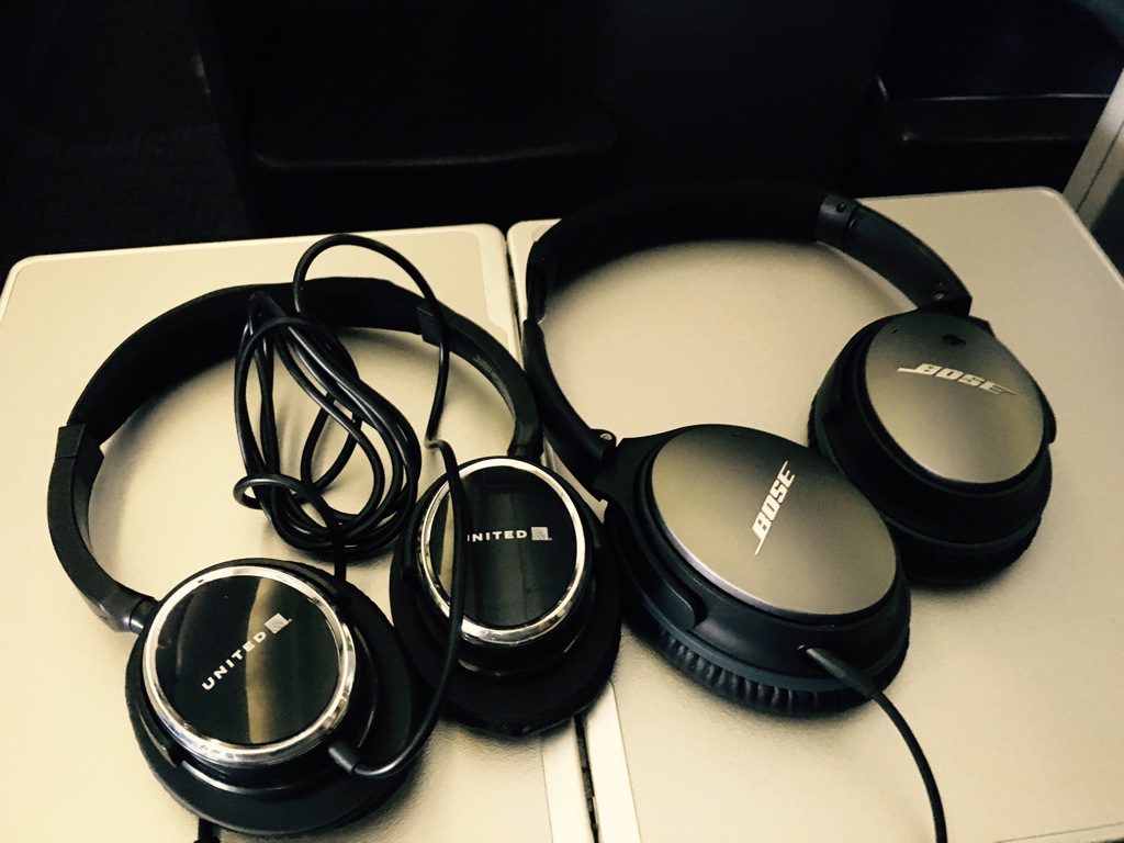 Die Fernbedienung für das IFE befindet sich in der Armlehne des Sitzes. In der Busienss Class bietet United auch recht gute Kopfhörer an. Ich bevorzuge allerdings wie immer meine Bose IQ 25, welche mich komplett von meiner Umwelt abschirmen und ein fantastisches Klangbild haben.