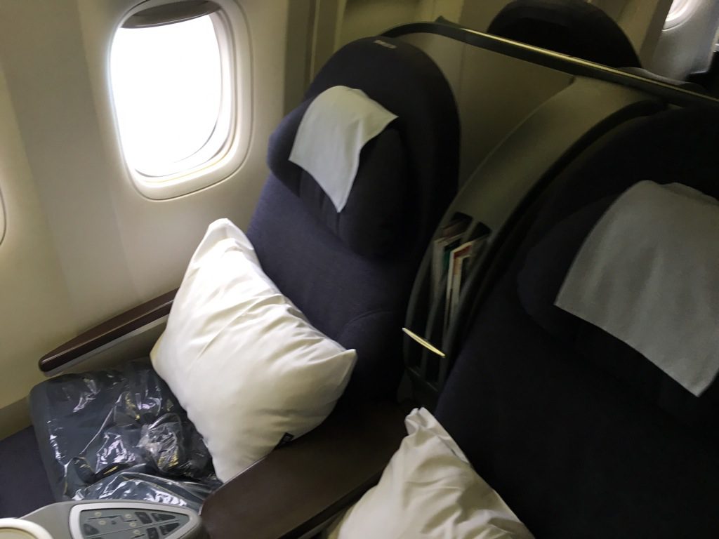 Der United Business Class Sitz in den „ex United“ Boeing 777-200 bietet trotz der 2-4-2 Anordnung erstaunlich viel Freiraum. Man erreicht dies allerdings durch verhältnismäßig schmale Armlehnen zum Nachbarn. Dennoch hatte ich noch nie Probleme hierdurch. Auf dem Sitz befand sich beim Einsteigen bereits ein großes Kissen, sowie eine Decke.