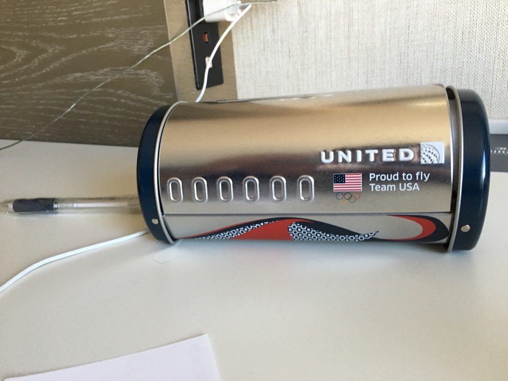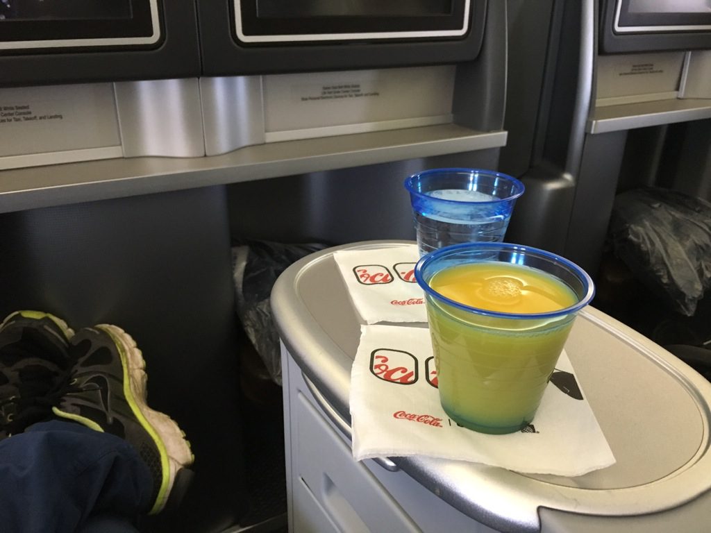 Direkt nachdem ich mich hingesetzt hatte fragte mich eine Flugbegleiterin, ob ich etwas vor dem Start trinken möchte. Ich bestellte ein Glas Orangensaft. Dieser wurde mir auch sehr schnell, wie bei United am Boden üblich, in einem Plastikbecher überreicht. Auch wenn es nicht wirklich ein Problem ist, werde ich nie verstehen, warum man am Boden keine Gläser verwendet.