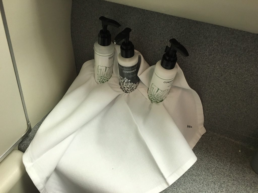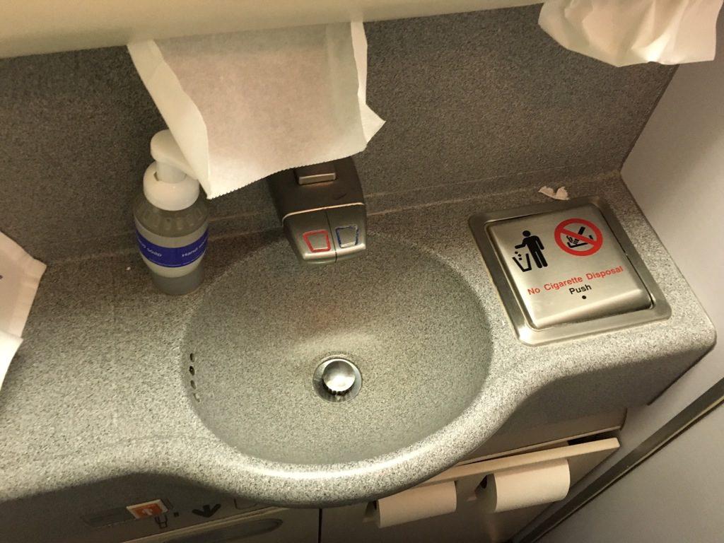 Insbesonder in den Waschräumen sieht man den Flugzeugen bereits das Alter an. Die Business Class verfügt über lediglich zwei Waschräume, welche außer zwei Cremes keine weiteren Amenitys bieten.
