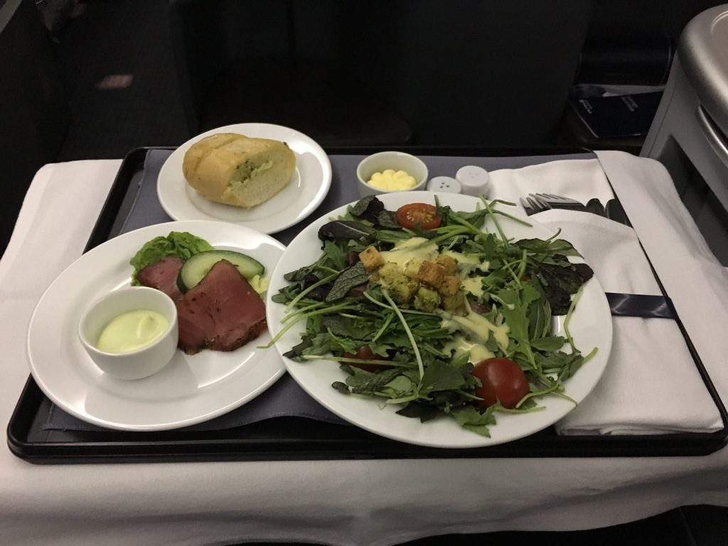 Etwa 2 Stunden vor der Landung wurden die Einreiseformulare, wenn benötigt, verteilt und mit dem zweiten Service begonnen. Auf einem Tablett wurde der Salat mit dem kalten gegrillten Hühnchen serviert. Was mir leider komplett fehlte, war Dressing zum Salat. Zusammen mit dem einfachen Brötchen ohne Auswahl und dem frischen Obst, war es ein recht unspektakuläres Essen.