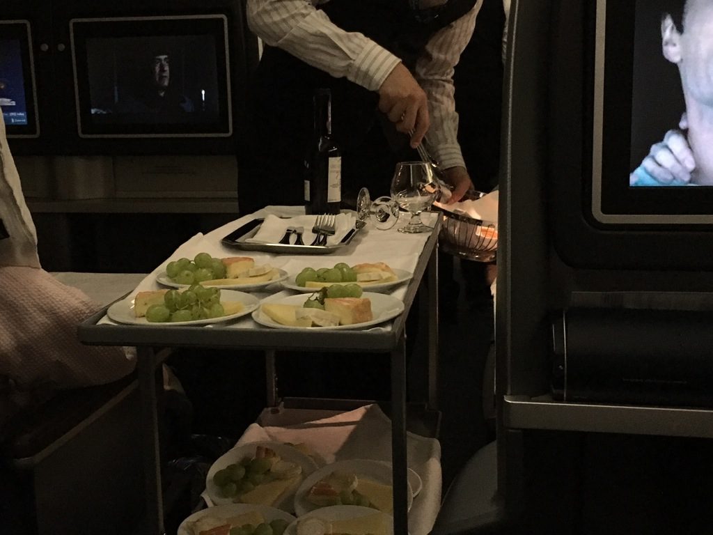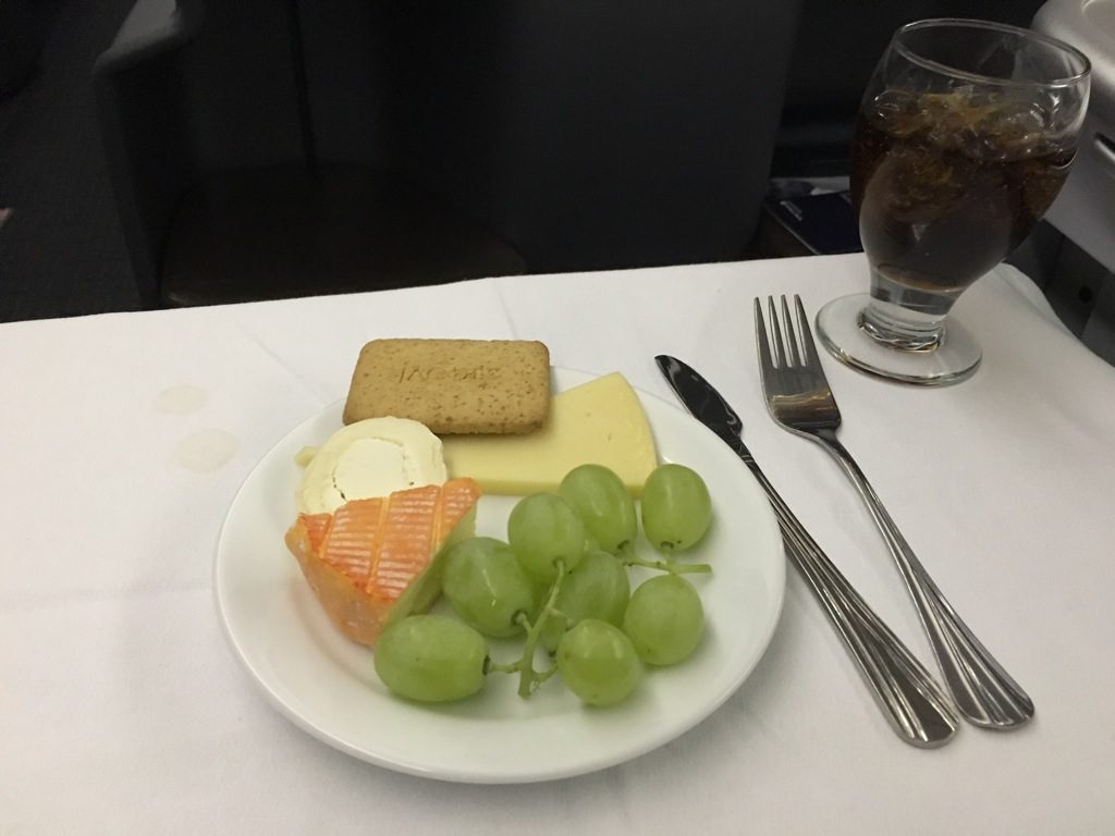 Nach dem Hauptgericht wurde das Tablett abgeräumt und der Teil des Service,s welcher mir persönlich am besten gefällt wurde begonnen. Als erstes wurde der Käsewagen durch den Gang geschoben. United hat allerdings keine Käseplatten, sondern fertige Teller mit einer Käseauswahl. Dazu wird einen Korb mit Kräckern, sowie Portwein angeboten.
