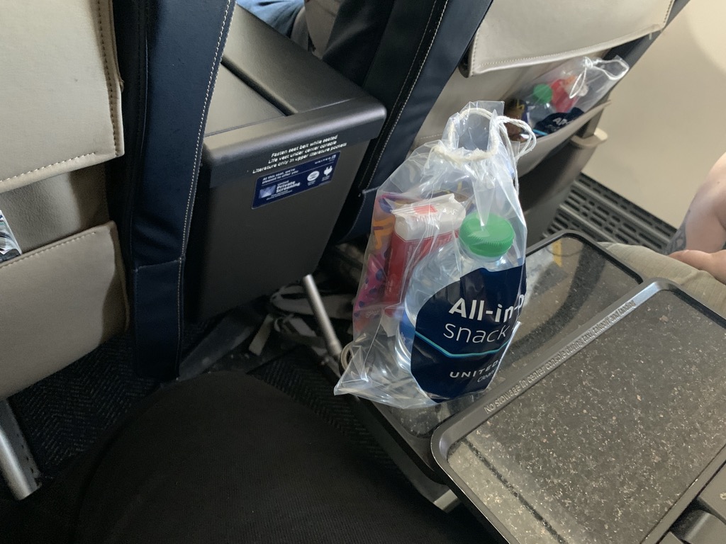 Die Flugzeit von Phoenix nach Denver beträgt etwa 90 Minuten und auf dieser Flugzeit gab es auch vor Corona kein wirkliches Catering. Lediglich ein Snack Korb wurde gereicht, welcher aktuell gestrichen ist. Alle Passagiere erhalten aber eine All in one Snack Bag, in welcher ein Wasser sowie Brezeln und Kekse sind. Weitere Snacks gibt es erst ab drei Stunden Flugzeit in der First Class.