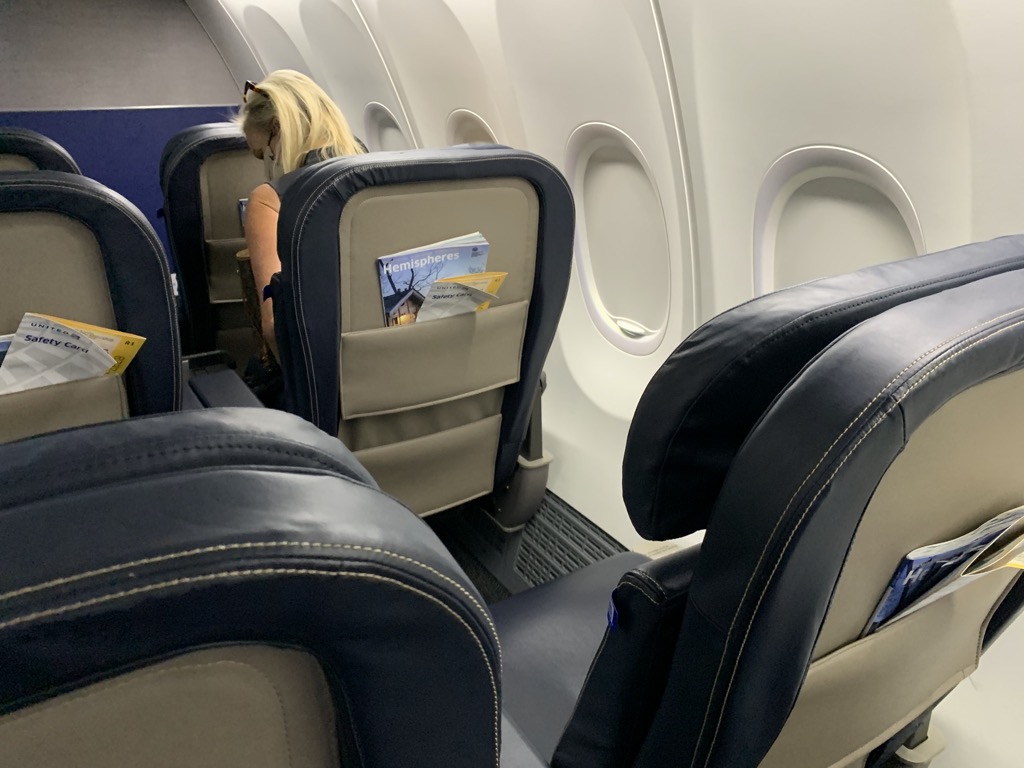 Beim Einstigen in die Boeing 737MAX deutete tatsächlich nichts auf das Flugzeug hin und auch die Kabine sah aus wie die einer moderne Boeing 737-900 von United Airlines. In der First Class sind 20 Sitze in fünf Reihen verbaut mit einer bequemen 2-2 Bestuhlung.