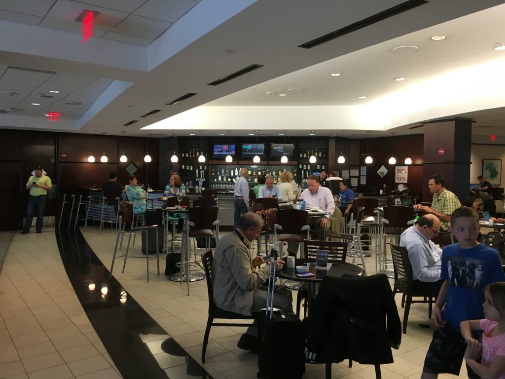 Im hinteren Bereich der Lounge befindet sich die Bar. Hier gibt es auch eine Reihe von Bartischen und Hockern. Mit dem Fernseher, auf dem ein Baseballspiel lief erinnerte mich diese Bar sehr an einen Sports Bar. Mit dem kostenlosen Alkohol, welcher an der Bar ausgeschenkt wird, war die Stimmung hier auch entsprechend gut.