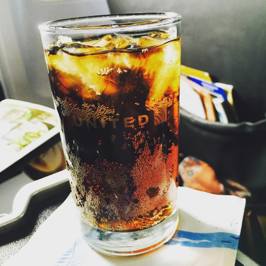 Nach dem Start wurde eine weitere „Getränkerunde“ serviert. Neben dem identischen Getränkesortiment, wie in der United Economy Class, sind in der United Express First Class auch alkoholische Getränke kostenlos und werden in einem Glas serviert.